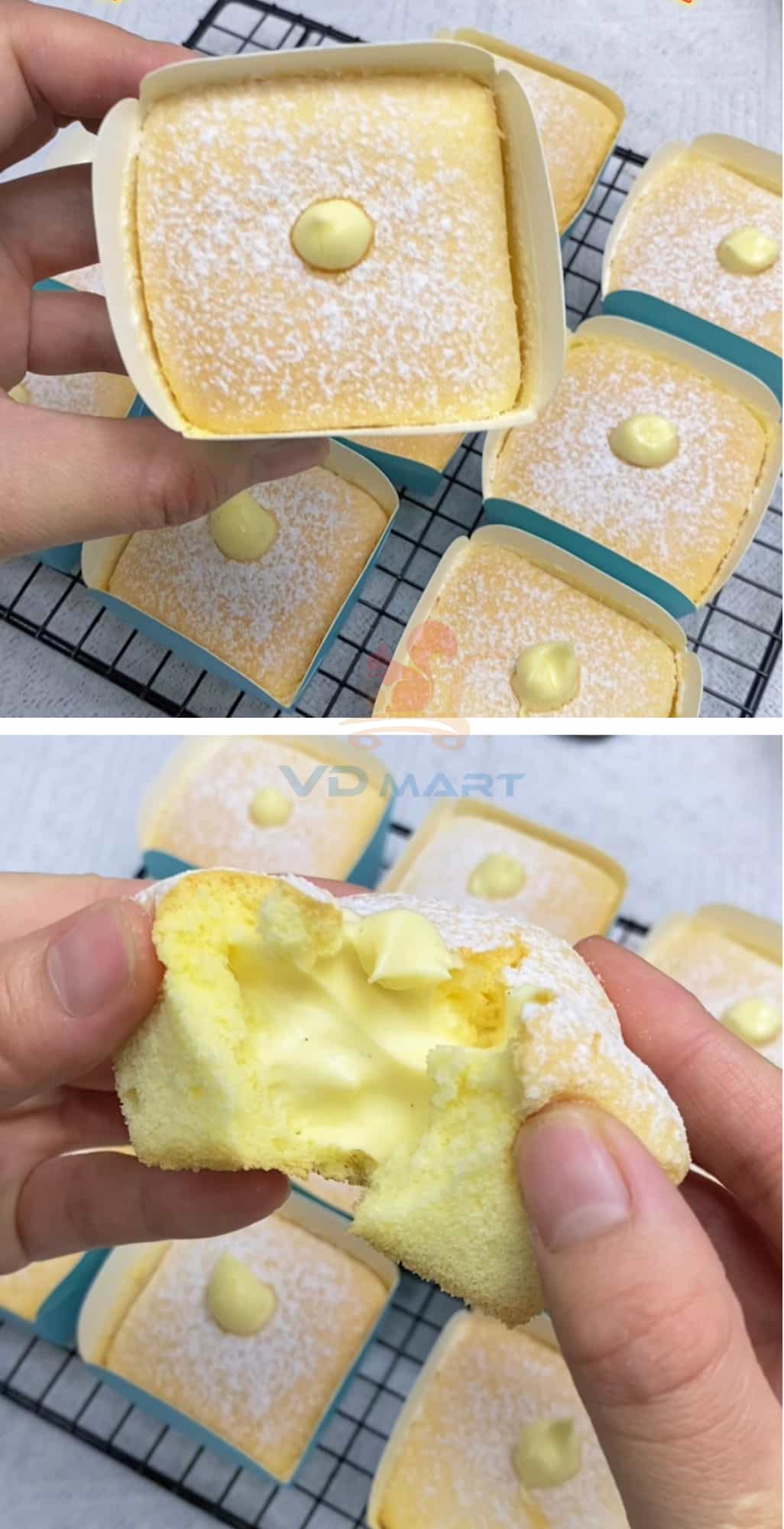 B12: Bơm nhân kem trứng sữa vào . Có thể rắc thêm chút đường bột lên trên mặt bánh để trang trí nha.