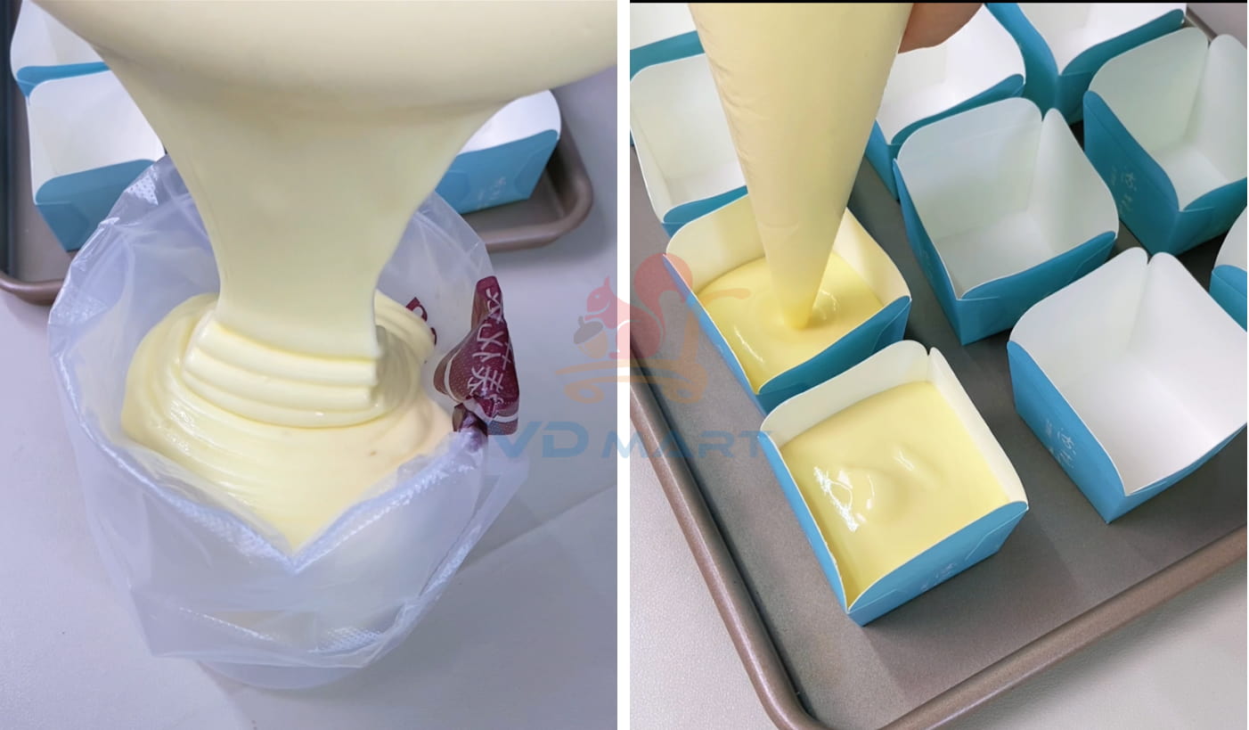 B7: Cho nhân kem trứng sữa vào túi bắt kem và cho vào tủ lạnh đợi lát nướng xong bánh thì bơm nhân vào.
