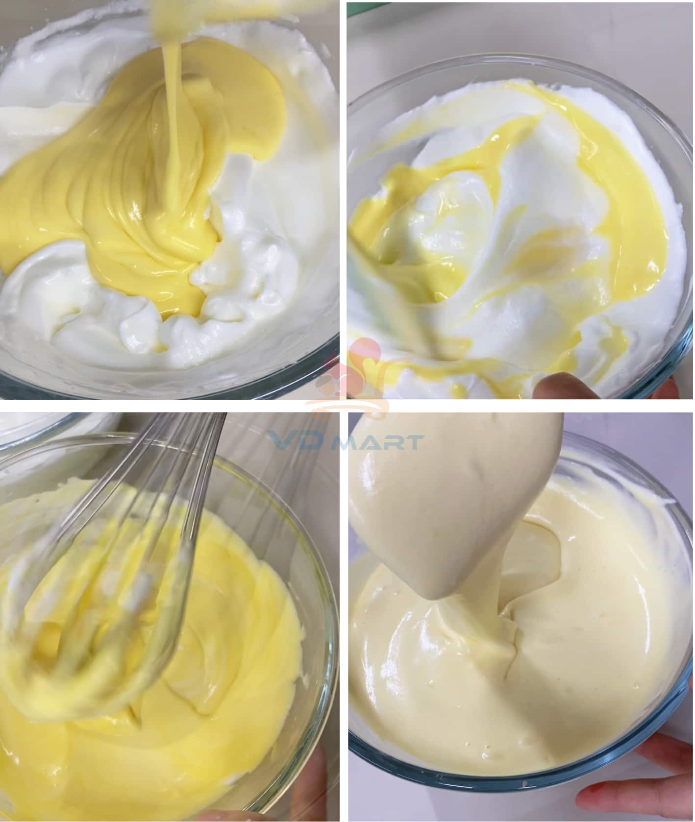B6:Cho 100gram kem tươi đánh bông cứng cùng với 10gram đường, sau đó cho vào sốt trứng sữa bên trên và trộn đều. Vậy là đã có nhâm kem trứng sữa siêu ngon.