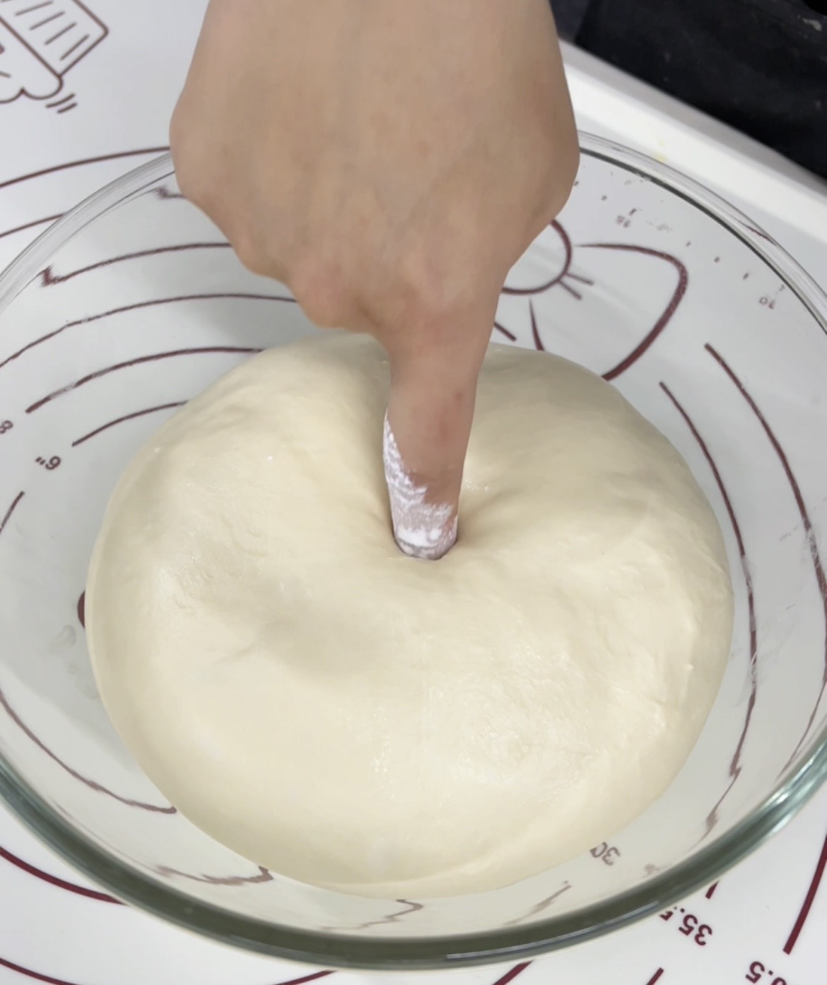 B4: Sau khi hết thời gian ủ nở, ta dùng tay chọc vào giữa khối bột một lỗ cho xẹp bọt khí và nhồi sơ qua bằng tay.