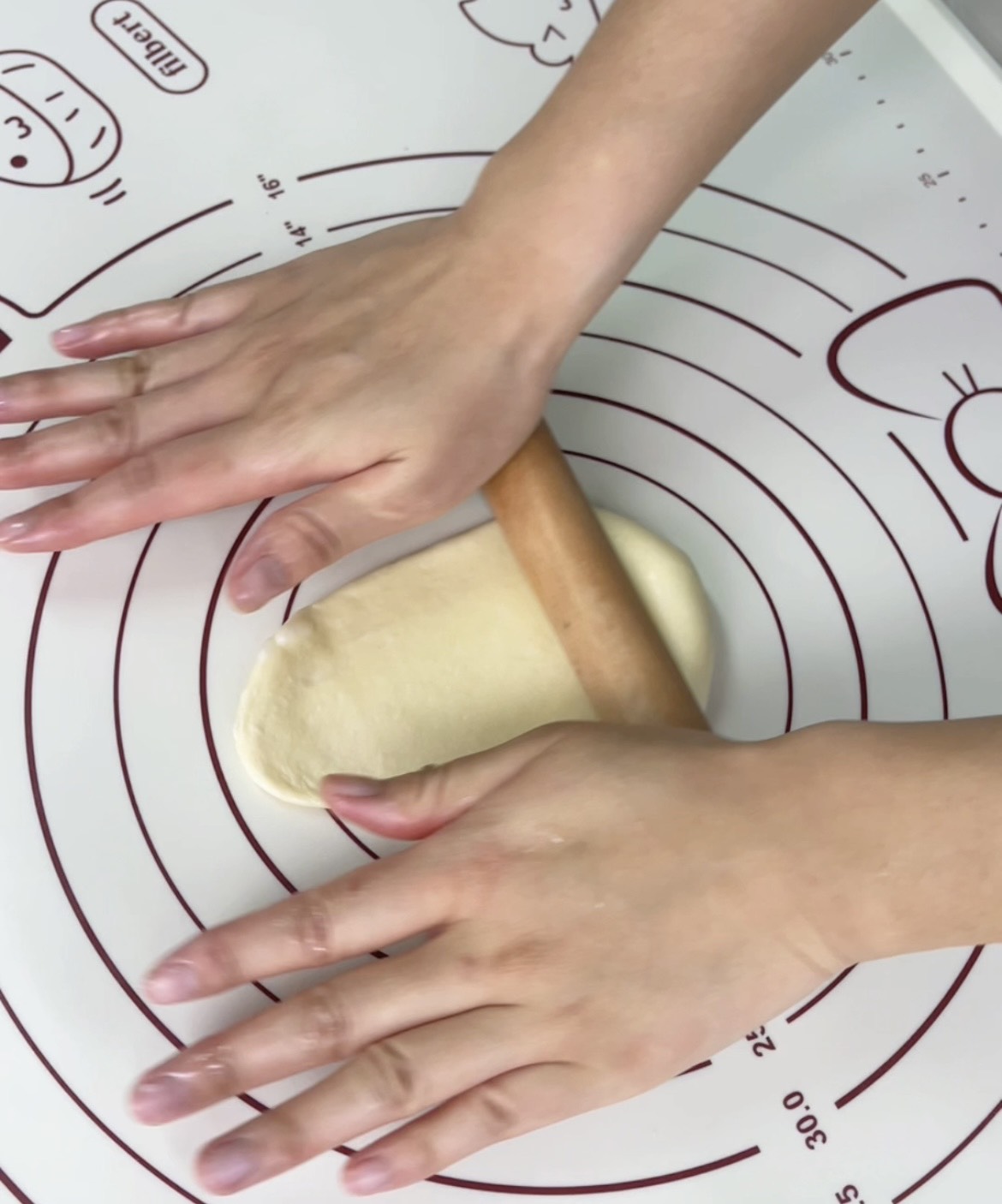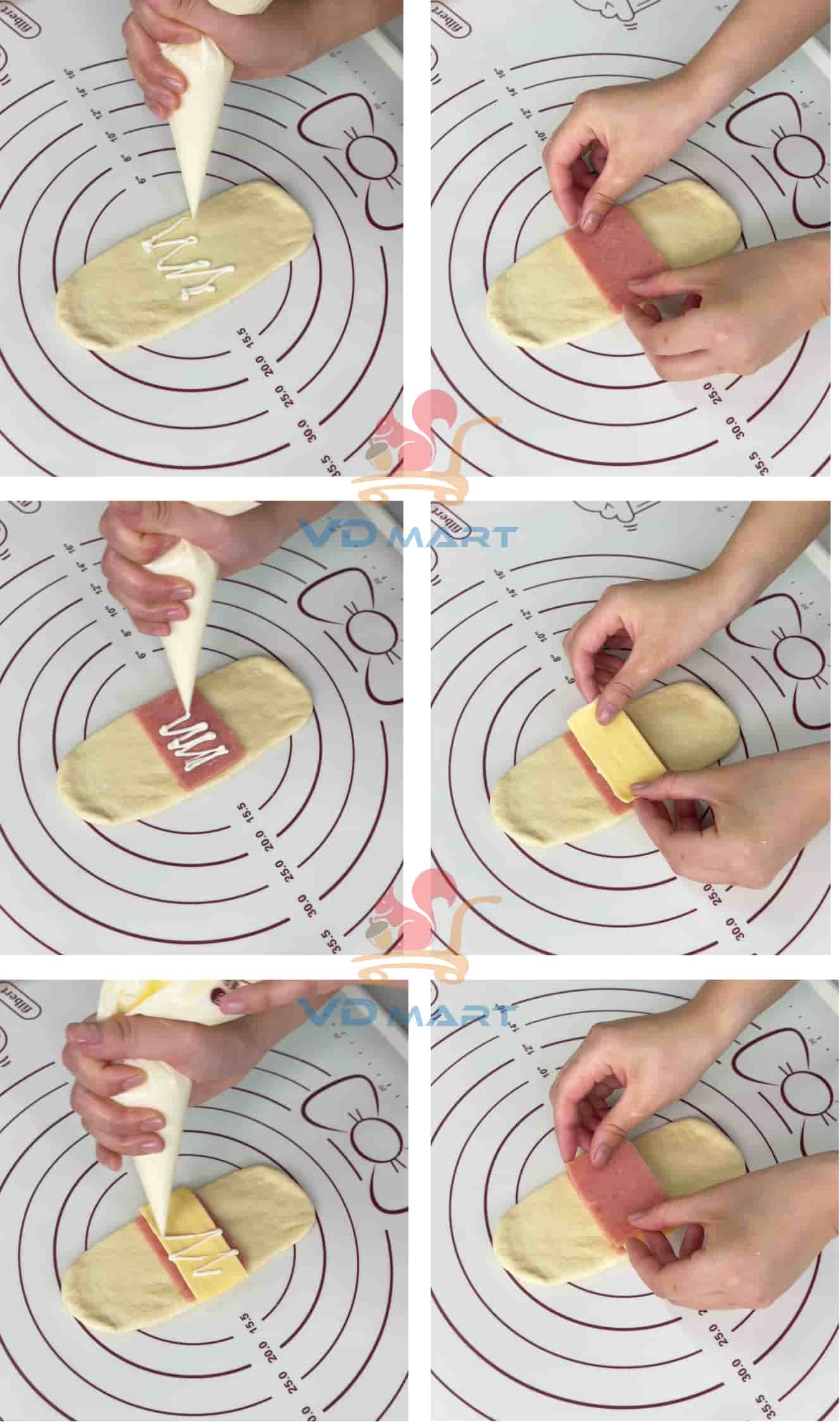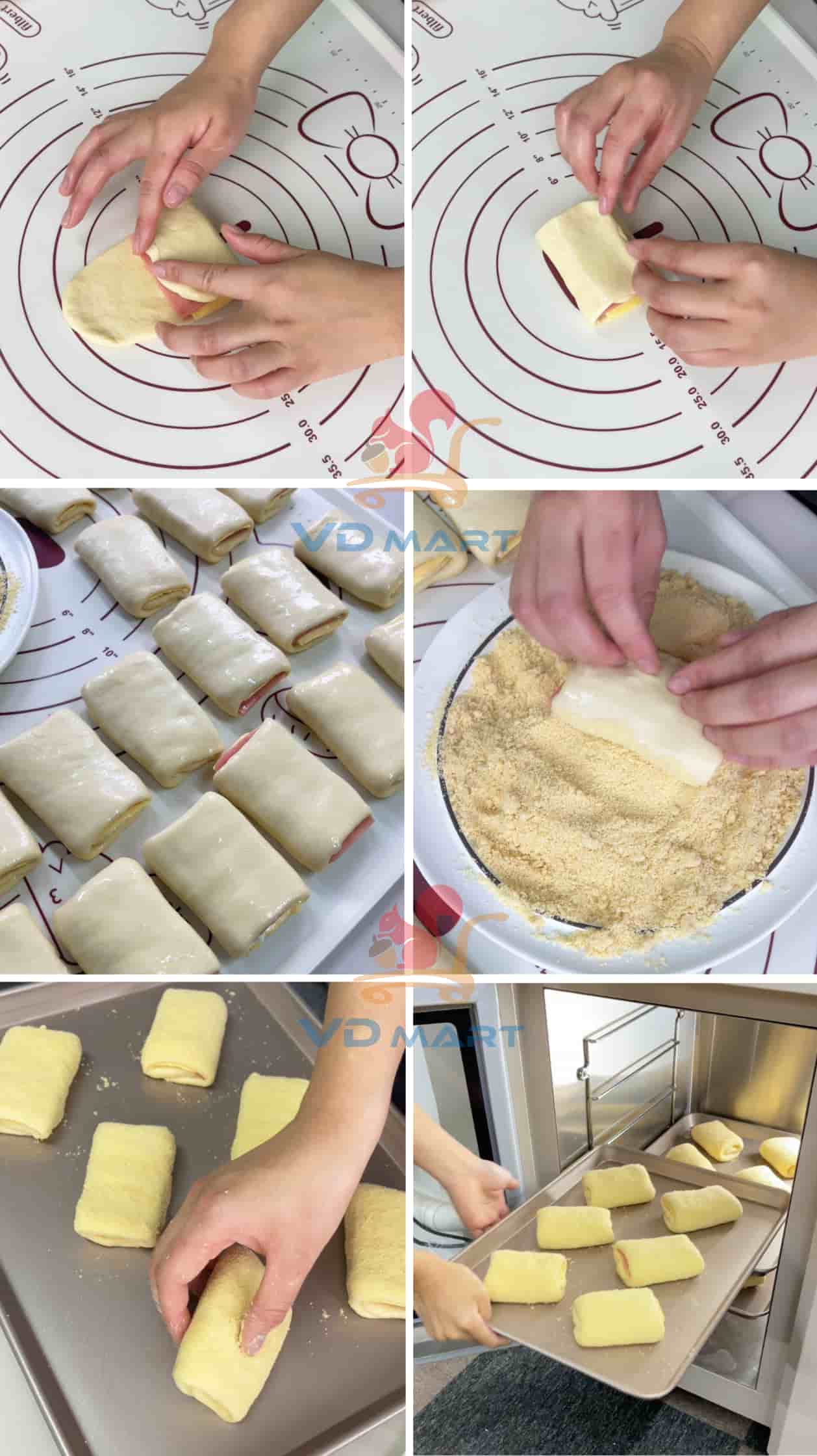 B7: Cán mỏng khối bột sao cho chiều rộng của bột bằng chiều dài của miếng giăm bông và phô mai