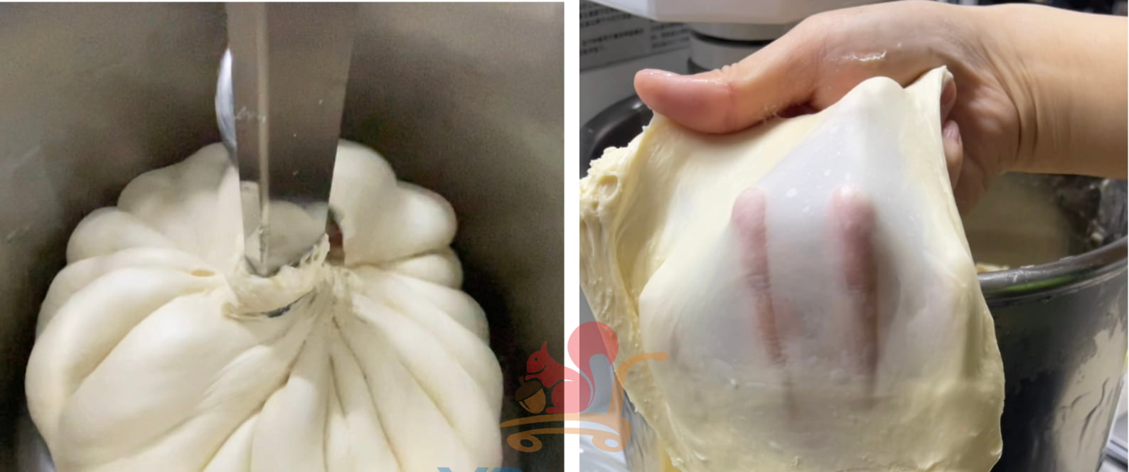 Cho tất cả nguyên liệu vào âu nhồi bột (trừ bơ) rồi nhồi đến khi bột hòa quyện hoàn toàn, (khoảng 5 phút). Sau đó cho bơ vào ( chia bơ thành 3 phần, lần lượt bơ lượt trước tan gần hết thì cho bơ lượt tiếp theo vào). Tổng thời gian nhồi bột khoảng chừng 25 phút. Nhồi đến khi bột không còn dính tay và kéo màng là đạt.