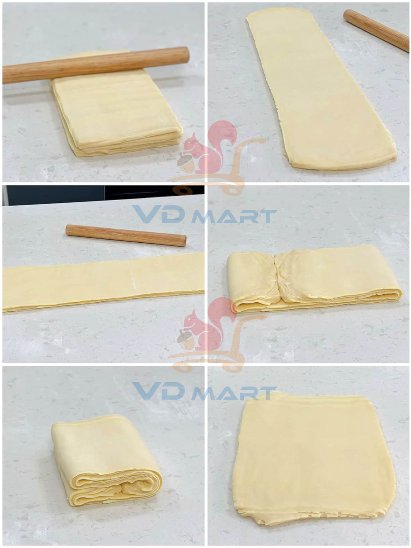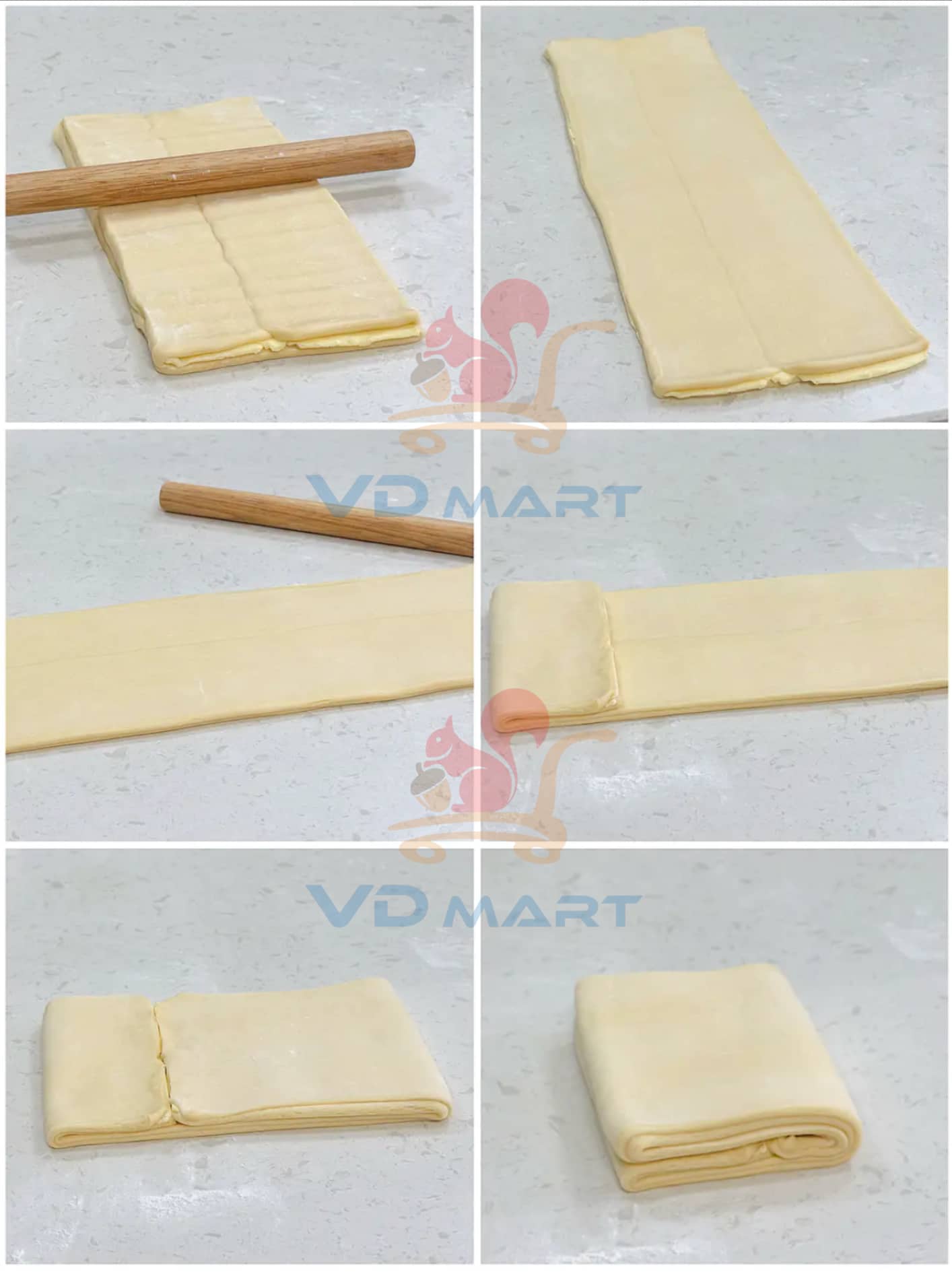 - Áng chừng bột thành 6 phần. Một đầu gấp 1 phần lên, phần còn lại gấp 2 phần lên. Sau đó gấp đôi khối bột lại (nếu thấy bột nóng, có dấu hiệu bị chảy bơ thì bọc khối bột lại và để tủ đá 20 phút)