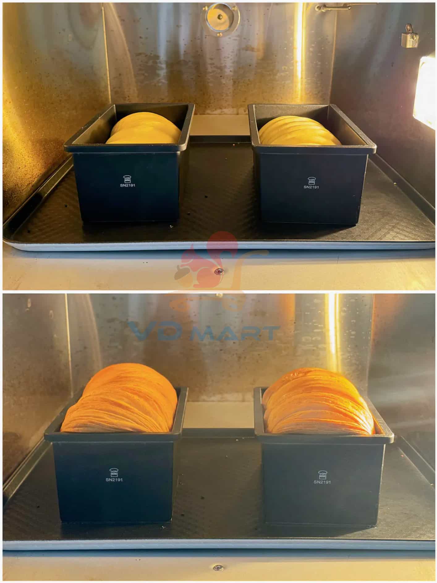 - Cho bột vào khuôn và ủ đến khi bột nở 80% (Thời tiết mùa hè nên cho vào tủ mát ủ)