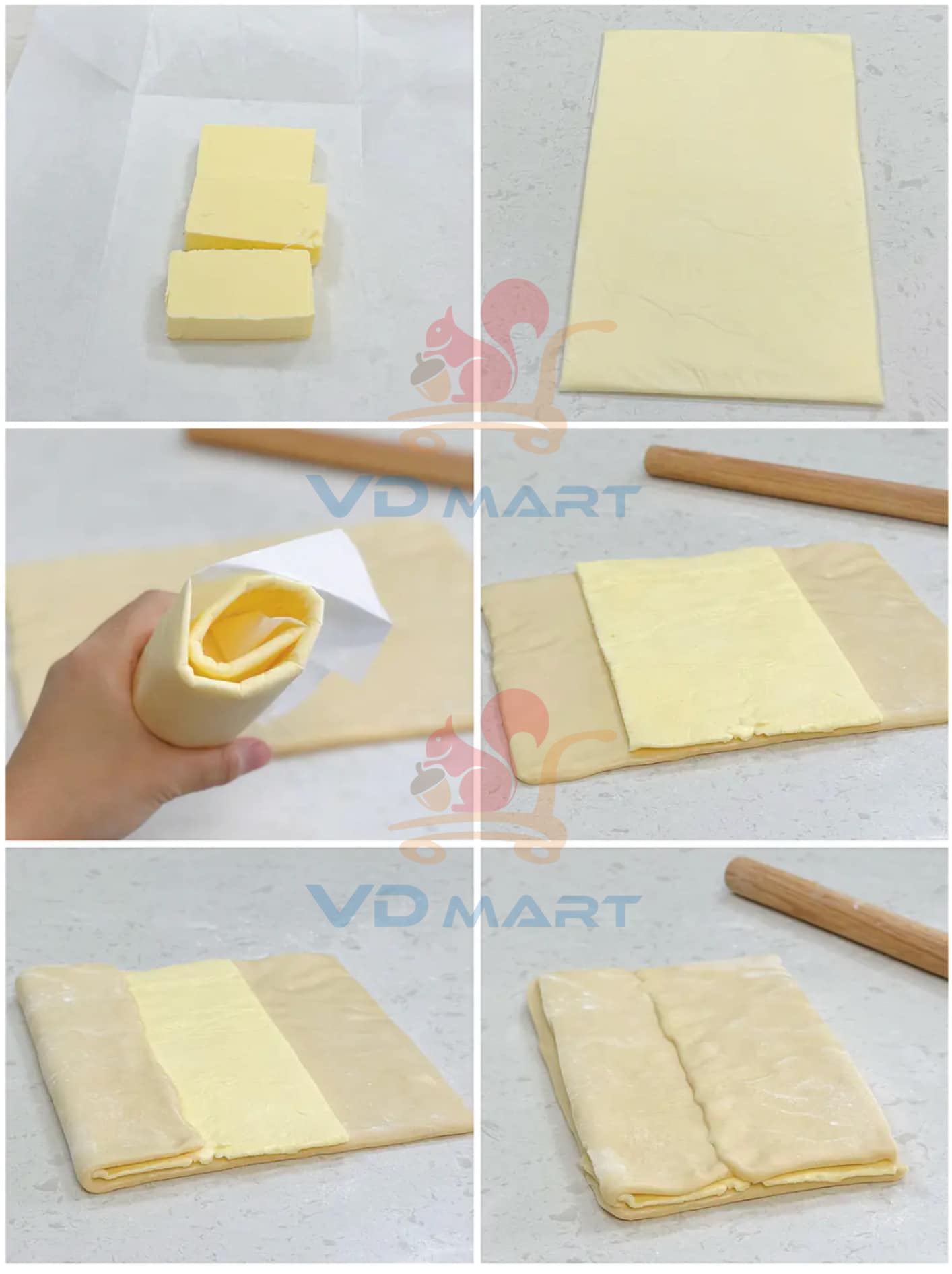 - Trong quá trình đợi bột đông lại, cán mỏng bơ theo kích thước 15x24cm và để tủ lạnh