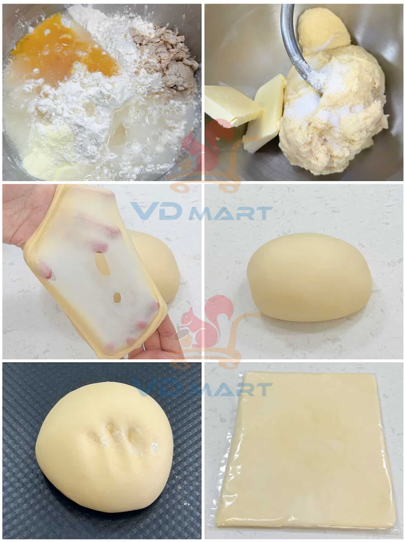 - Trộn tất cả nguyên liệu (trừ bơ và muối), nhồi đến khi thành khối bột đồng nhất.