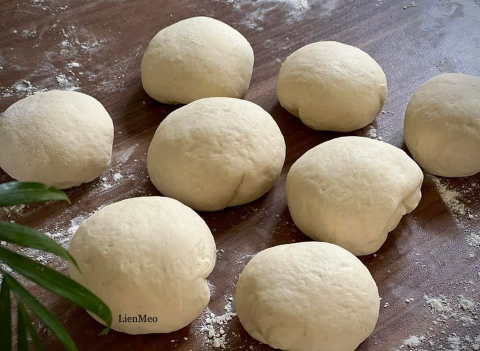 - Bột sau khi nhồi xong cho ra đạp bột khoảng 2 phút. Chia thành viên chừng 50-70gram . Vê bột tạo hình