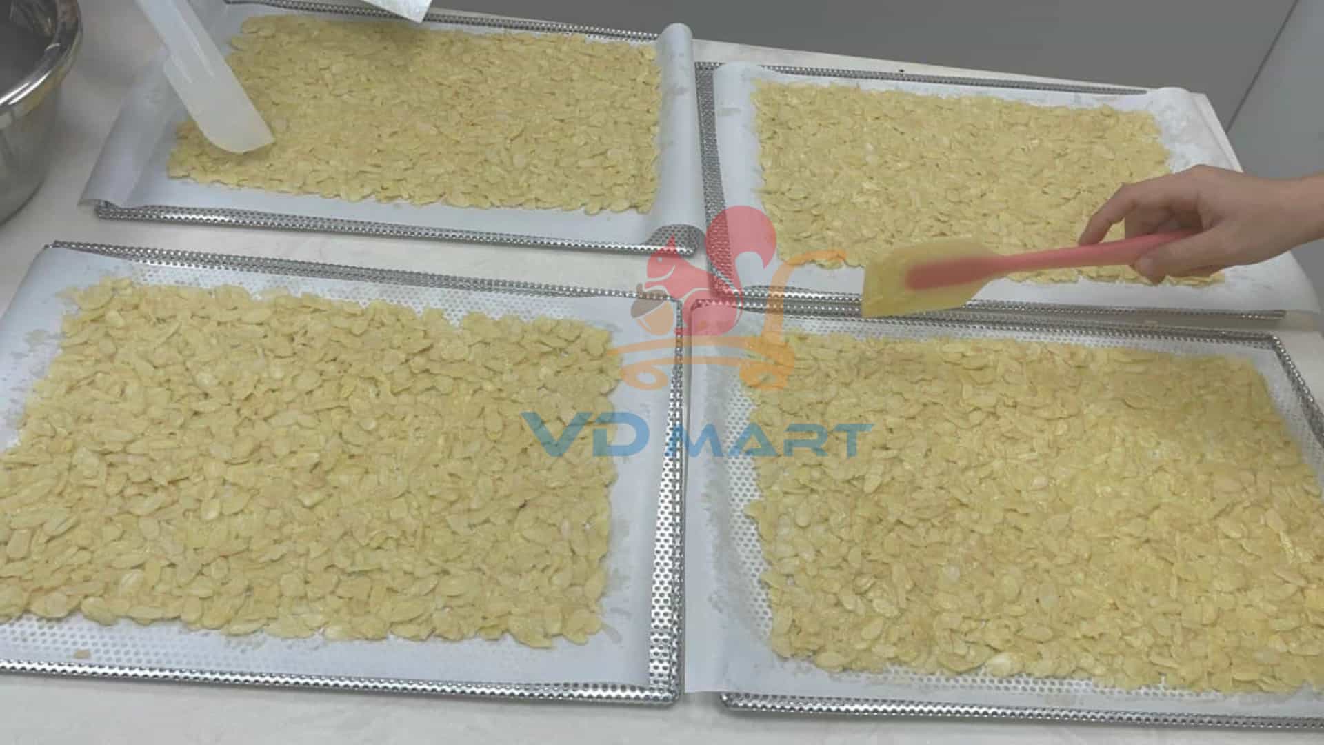 Chia hỗn hợp trên thanh 4 phần bằng nhau cho 4 khay. Sau đó dàn hỗn hợp thật mỏng và đều. Dàn càng mỏng thì bánh sấy càng nhanh, càng giòn hơn.