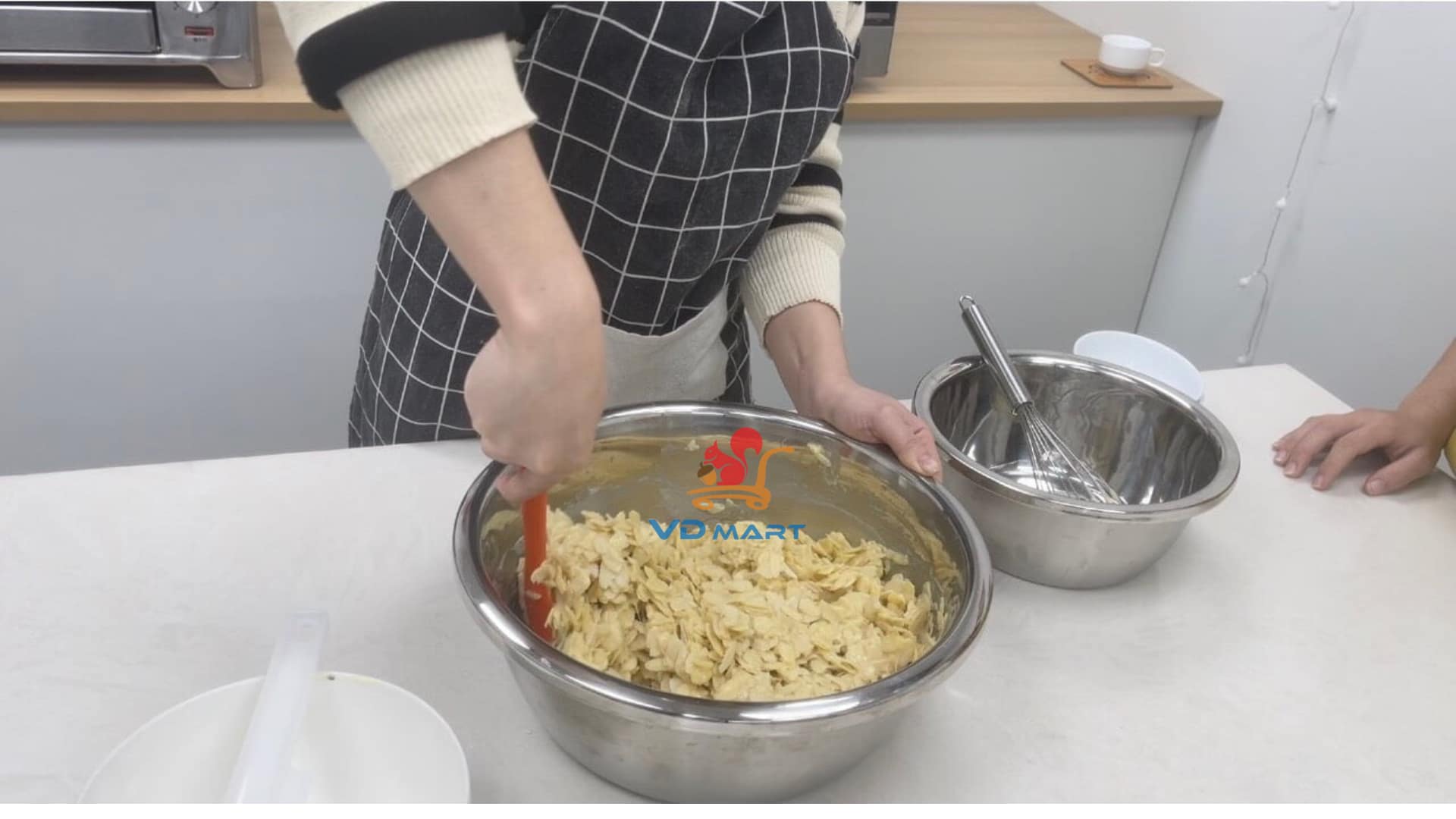 => Cho hạnh nhân vào và trộn đều hỗn hợp. Lưu ý, trộn nhẹ tay hạn chế hạnh nhân bị vụn.