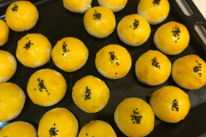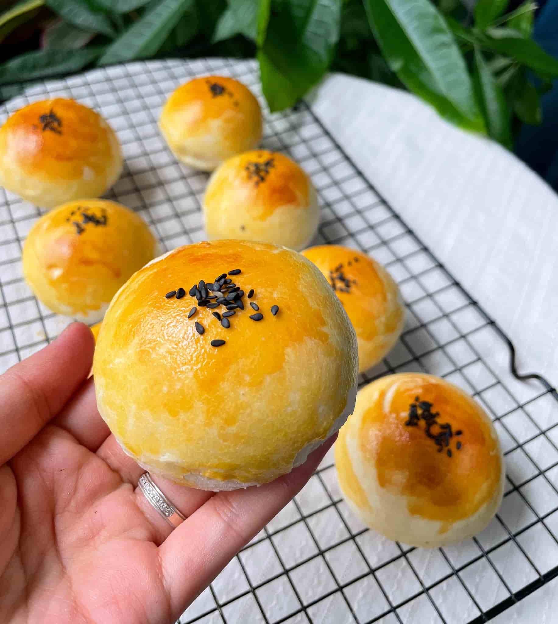 Bước 10: Nướng bánh đã chuẩn bị sẵn trong lò nướng hâm sẵn ở nhiệt độ 170 độ trong khoảng 20 phút, lấy ra, dùng chổi quét 2 lớp lòng đỏ trứng đã rây rồi rắc một ít vừng đen lên trên để trang trí. Nướng ở 150 độ trong 15 phút, cho đến khi mặt trên và mặt dưới có màu vàng nâu.
