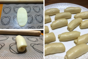 Bước 6: Tiến hành cán dẹt lớp thứ nhất. Lấy một miếng bột đã làm ở bước 5 và dùng que inox cuộn bột để tạo thành hình thuôn dài. Cuộn tròn từ trên xuống dưới và để yên trong 10 phút. Trong bước cán bánh nhớ nhẹ nhàng, không nên quá tay nếu không sẽ dễ bị gãy