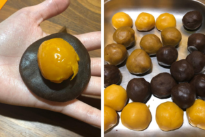 Bước 4: Trong khi chờ bột dầu ủ đạt có thể chia nhân đậu ít đường trước. Chia nhân đậu thành 15 viên nhỏ, nặng 30g, ấn dẹt rồi đặt lòng đỏ trứng muối lên trên, dùng tay cuộn nhẹ lên để bọc kín nhân lại rồi vo thành từng viên sau đó đặt sang một bên.