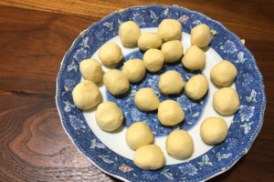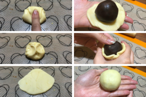 Bước 5: Cán dẹt khối bột đã nhào, bọc trong vỏ bánh rồi làm theo bước 4, dùng tay cuộn nhẹ lên để bọc kín bột lại rồi vo thành một quả bóng.