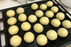 Bước 8: Lớp bọc ngoài nhân bánh. Dùng đầu ngón tay ấn vào giữa miếng bột, sau đó miết chụm hai cạnh vào trong và dùng cây cán bột nhẹ nhàng cán mỏng thành dẹt tròn. Đặt nó vào lòng bàn tay, lấy một trong những viên đã làm ở bước 4 đặt vào giữa , dùng tay đẩy nhẹ lên để bọc kín lại, sau đó nặn thành hình quả bóng rồi đặt vào khay nướng.