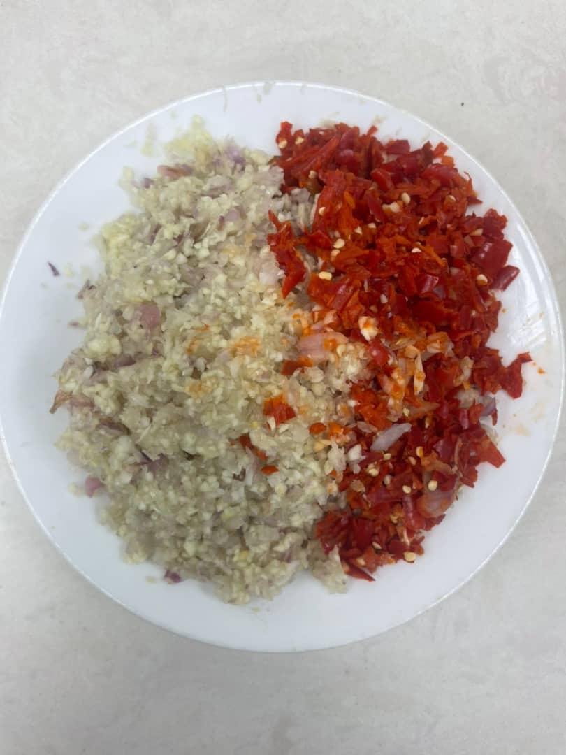 B1:Hành, tỏi, ớt sừng, 1/3 ớt chỉ thiên: băm nhỏ