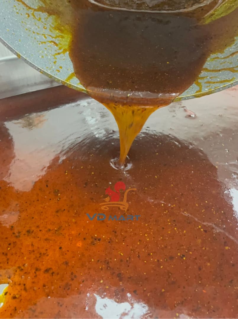 B3:Cho nghệ, nước sốt hấp gà, bột cả ri, bột ngũ vị hương, muối, tiêu, tương ớt, dầu hào, dầu điều, bột nêm, đường, nước mắm, bột ớt vào chảo dầu. Đun lửa vừa đến khi hỗn hợp sệt lại. Để hỗn hợp nguội bớt