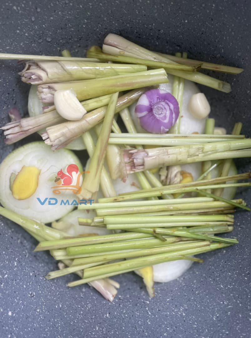 B2:Hành tây cắt thành khoanh dày chừng 1 cm, xếp kín đáy nồi. Tiếp tục xếp xả đập dập cắt khúc, gừng cắt lát vào.
