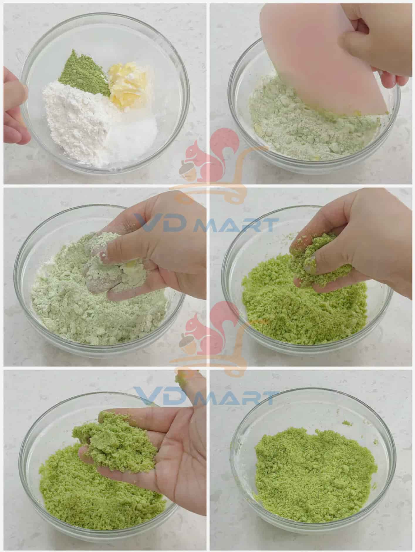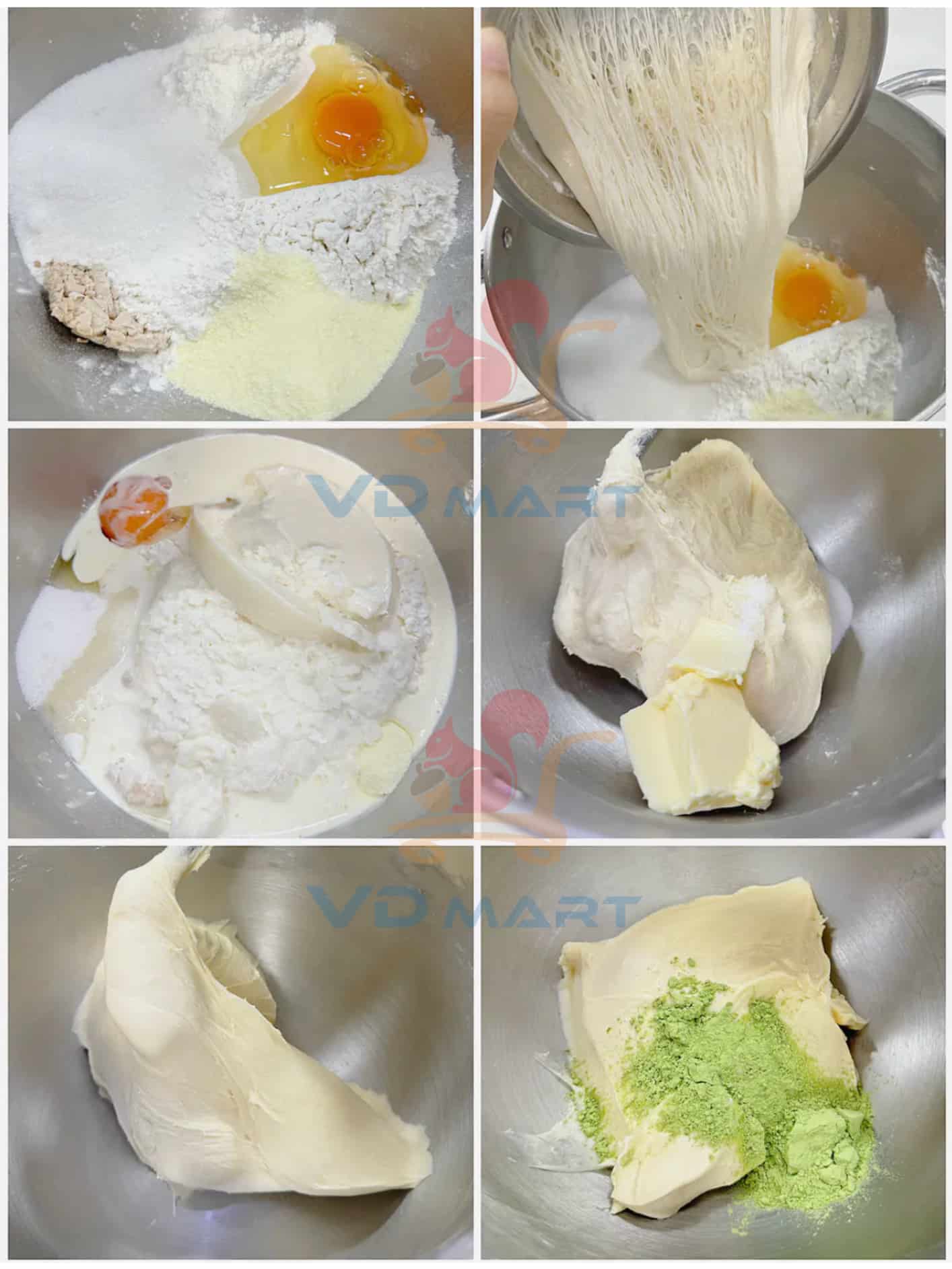 - Cho tất cả các nguyên liệu vào(trừ bơ và bột matcha,cacao) cùng phần bột cái vào nhồi đến khi thành khối bột đồng nhất. Tiếp đến cho bơ vào và nhồi đến khi bơ hòa quyện hết