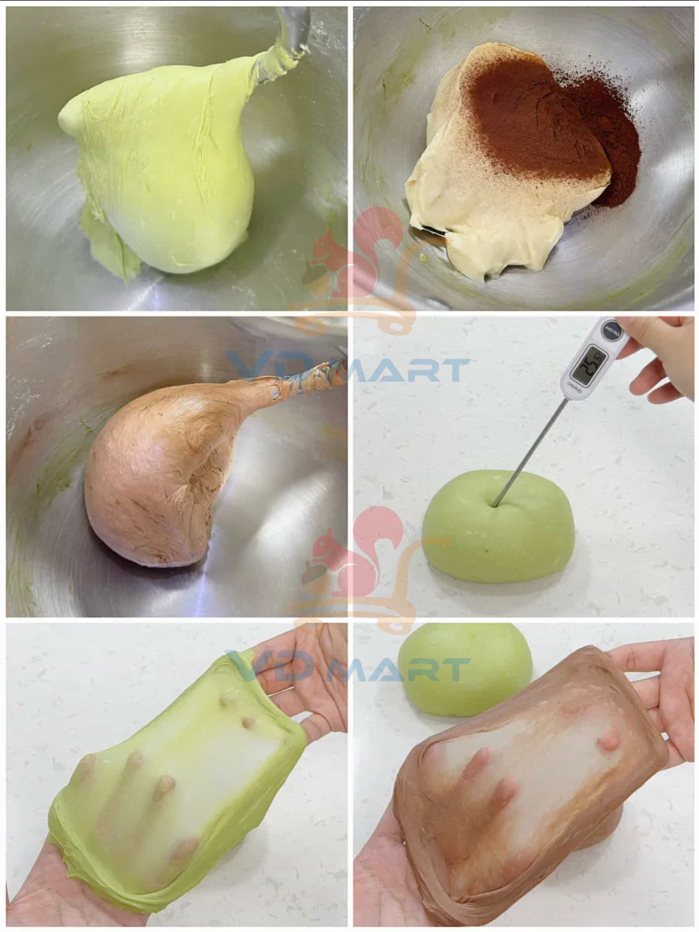 - Chia khối bột thành 2 phần bằng nhau, mỗi phần cho thêm bột matcha/cacao vào và nhồi đến khi bột đều màu, kéo màng mỏng là đạt