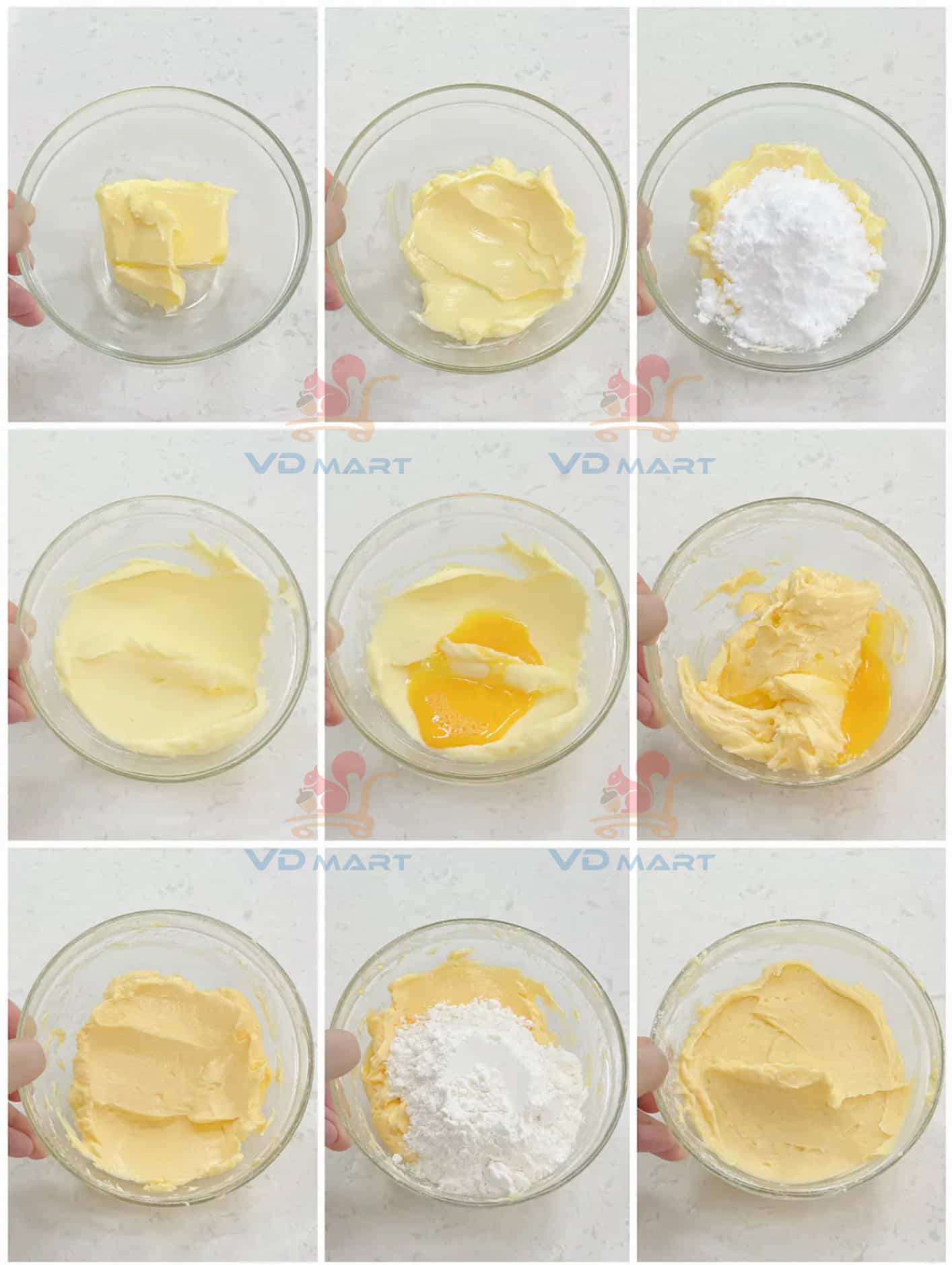 -Bơ để mềm nhiệt độ phòng, thêm đường bột vào và trộn đều. Cho trứng từ từ vào và trộn đều, cho trứng vào thành 3-4 lần ( tránh cho trứng vào cùng lúc dễ bị óc trâu).