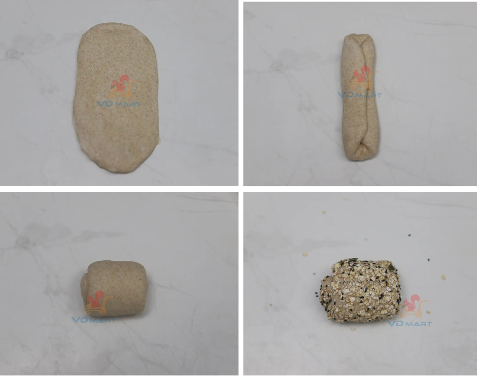 - Sau khi cuộn bột xong xịt 1 lớp sương lên bề mặt bột và lăn qua hỗn hợp hạt.