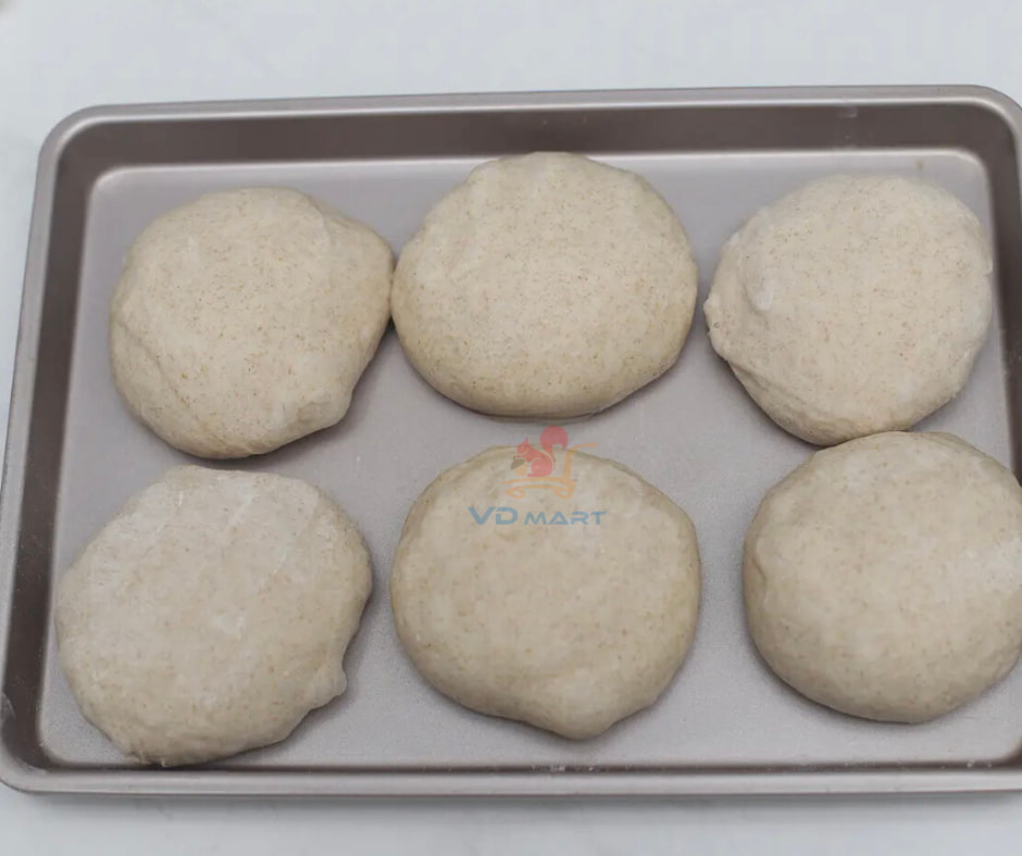 - Chia khối bột đã ủ thành 6 phần bằng nhau, vo tròn lại và bọc màng bọc để bột nghỉ 15’