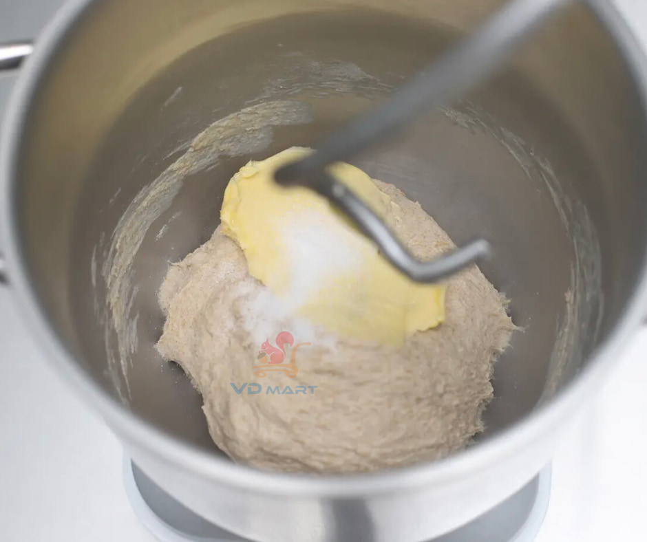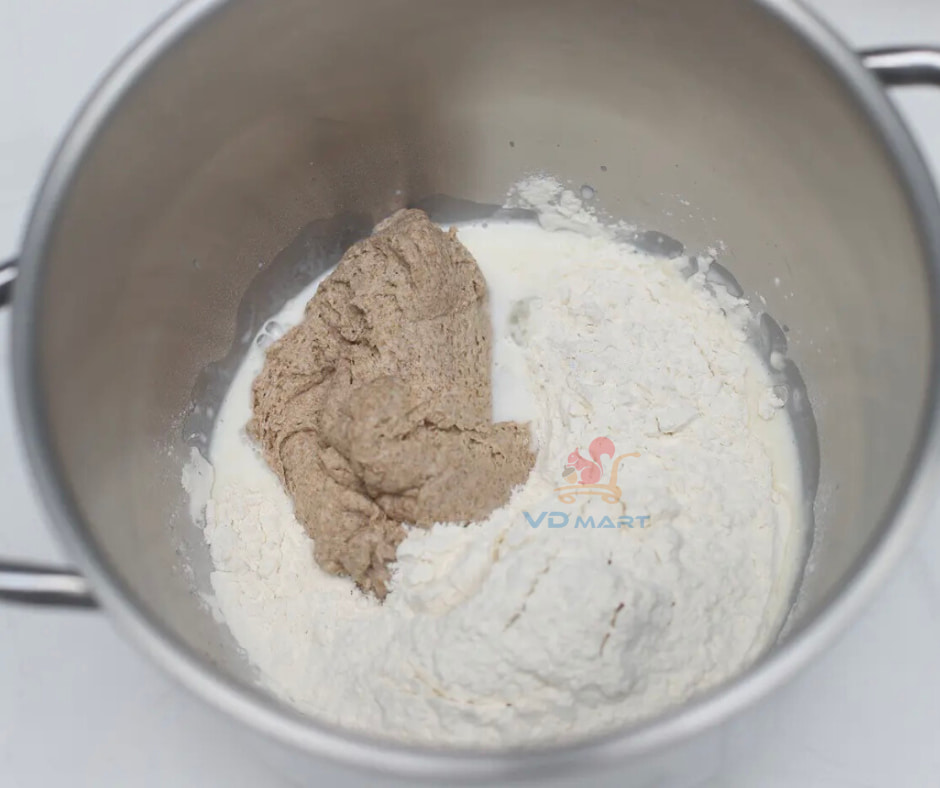 - Cho phần bột cái đã chuẩn bị vào cùng các nguyên liệu bột chính(trừ bơ và muối), sau đó nhồi đến khi khối bột mịn