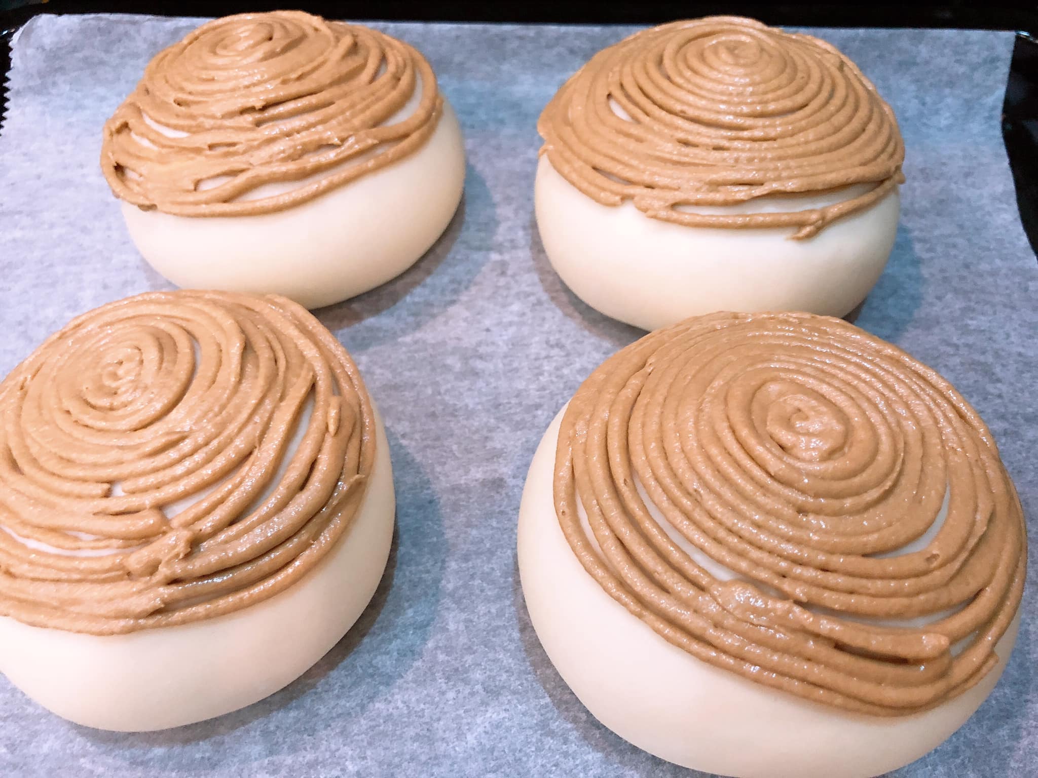 - Ủ nở bột đến khi gấp đôi, sau đó bóp topping lên trên mặt bánh