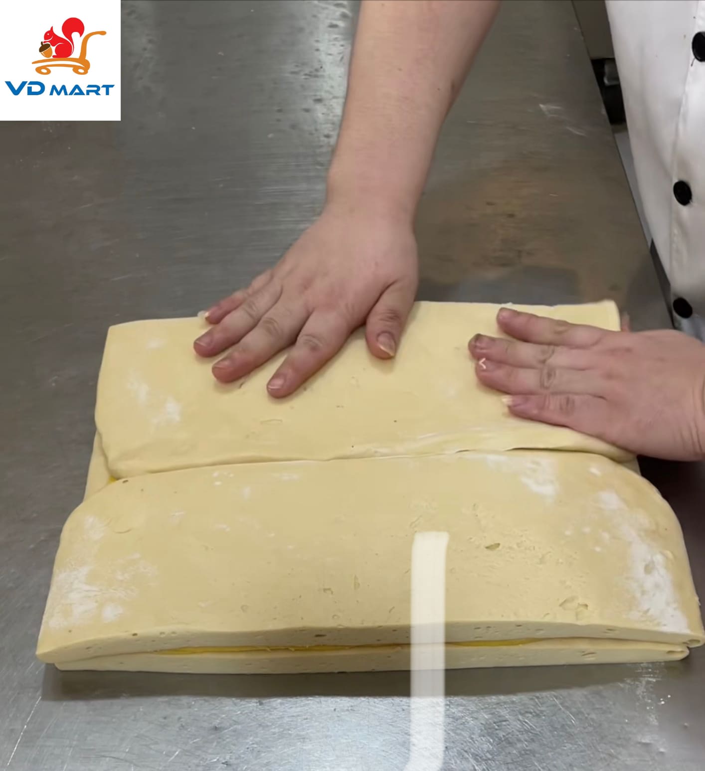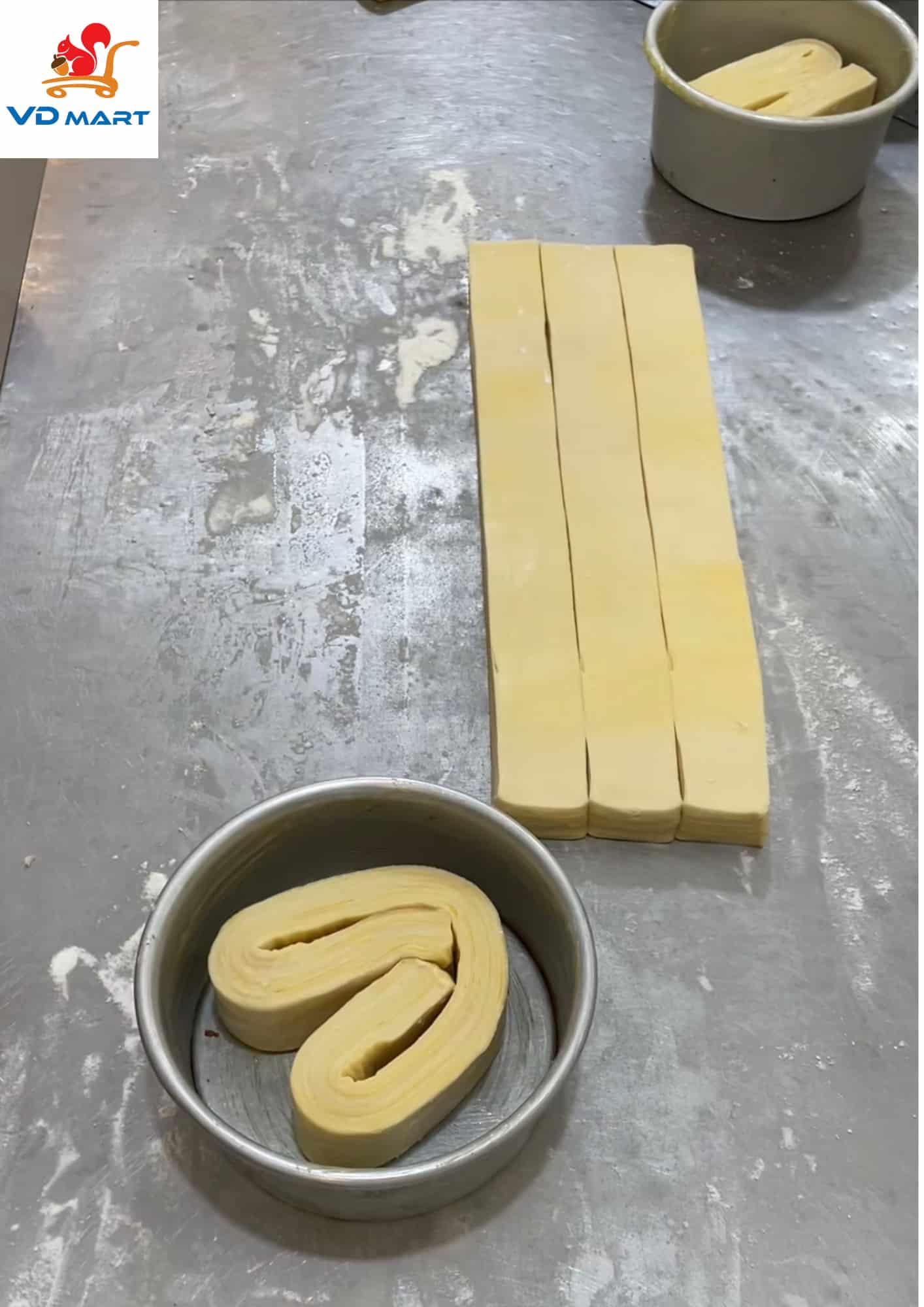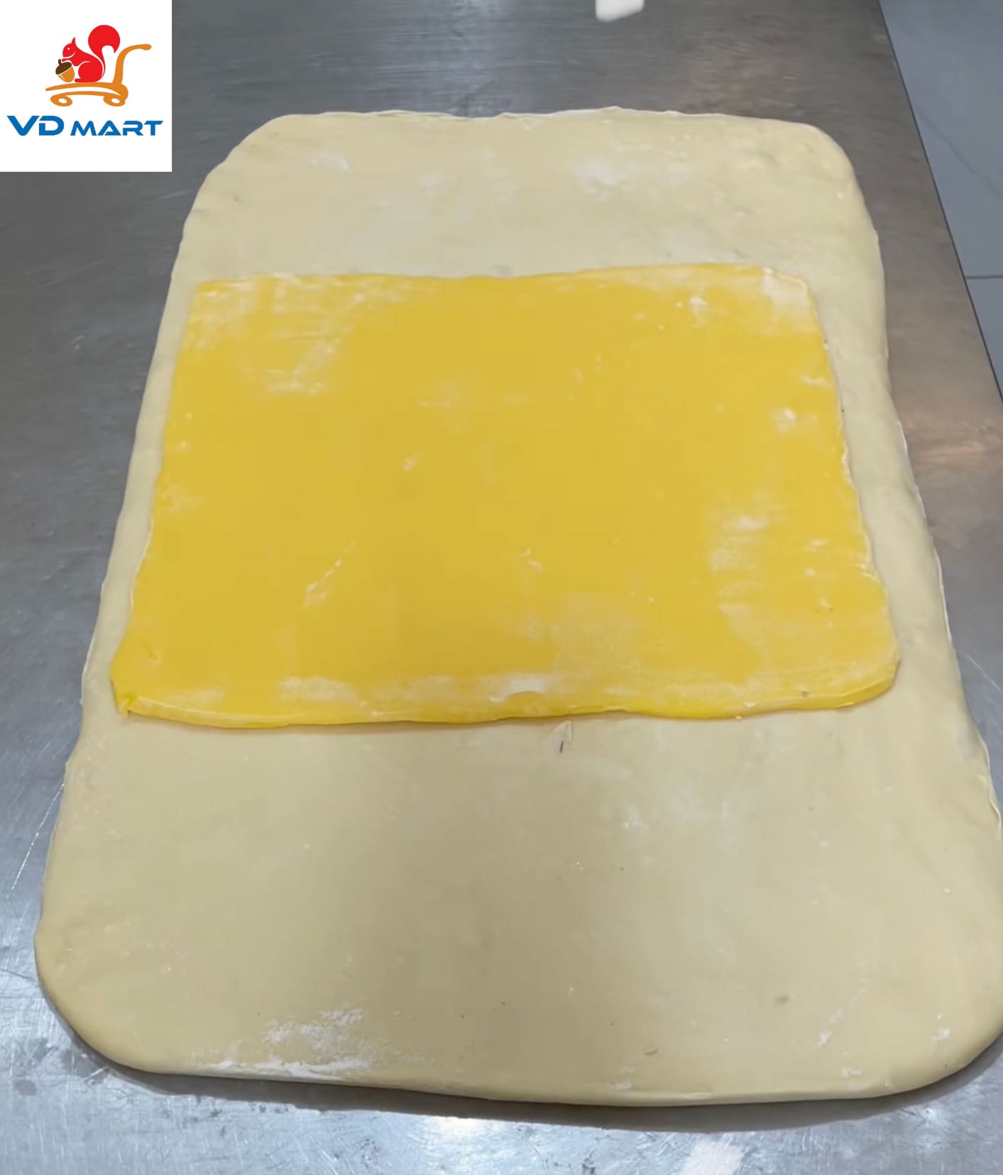 - Phần bột: Dàn mỏng thành hình chữ nhật có kíc thước 37x 72cm. Đặt miếng bơ đã cán mỏng trước đó vào chinhe giữa miếng bột.Gấp 2 đầu 2 bên lên phía trên miếng bơ.