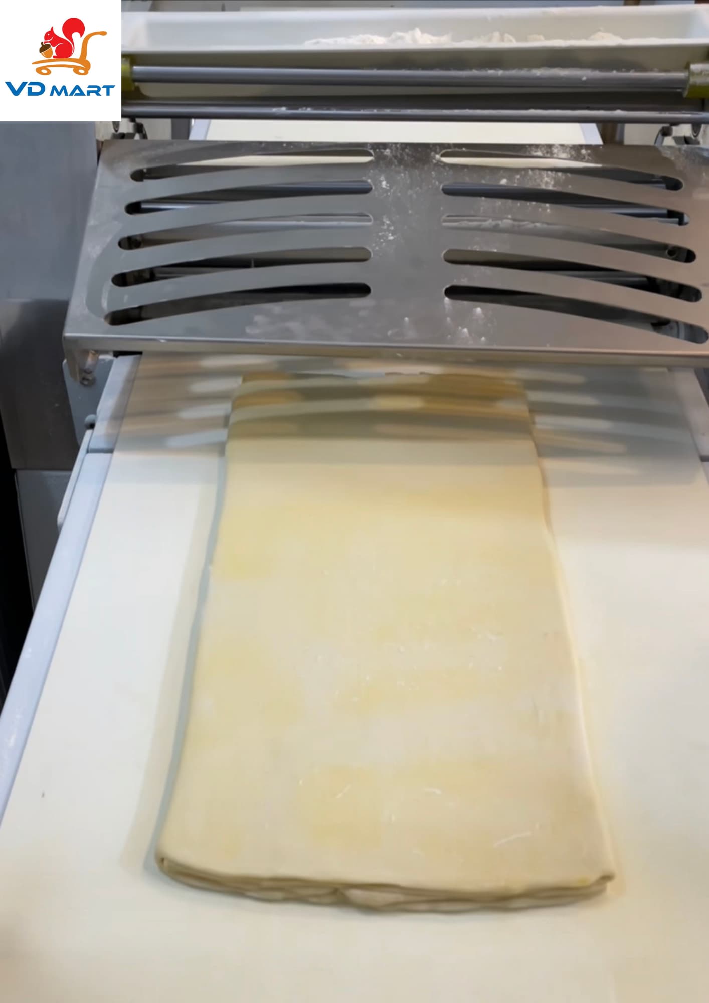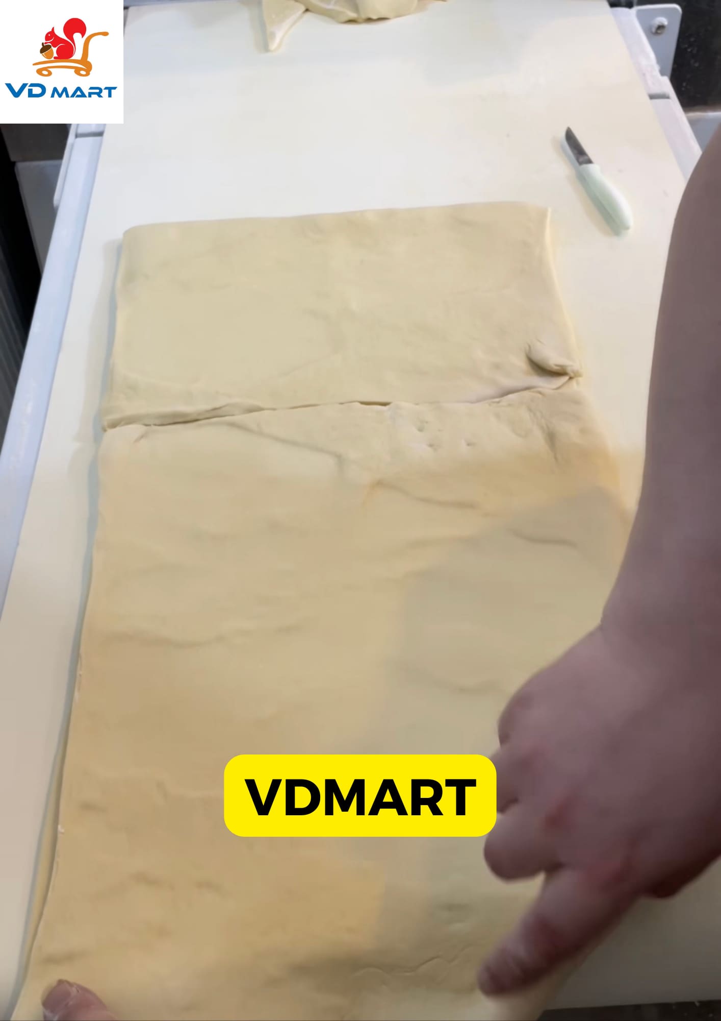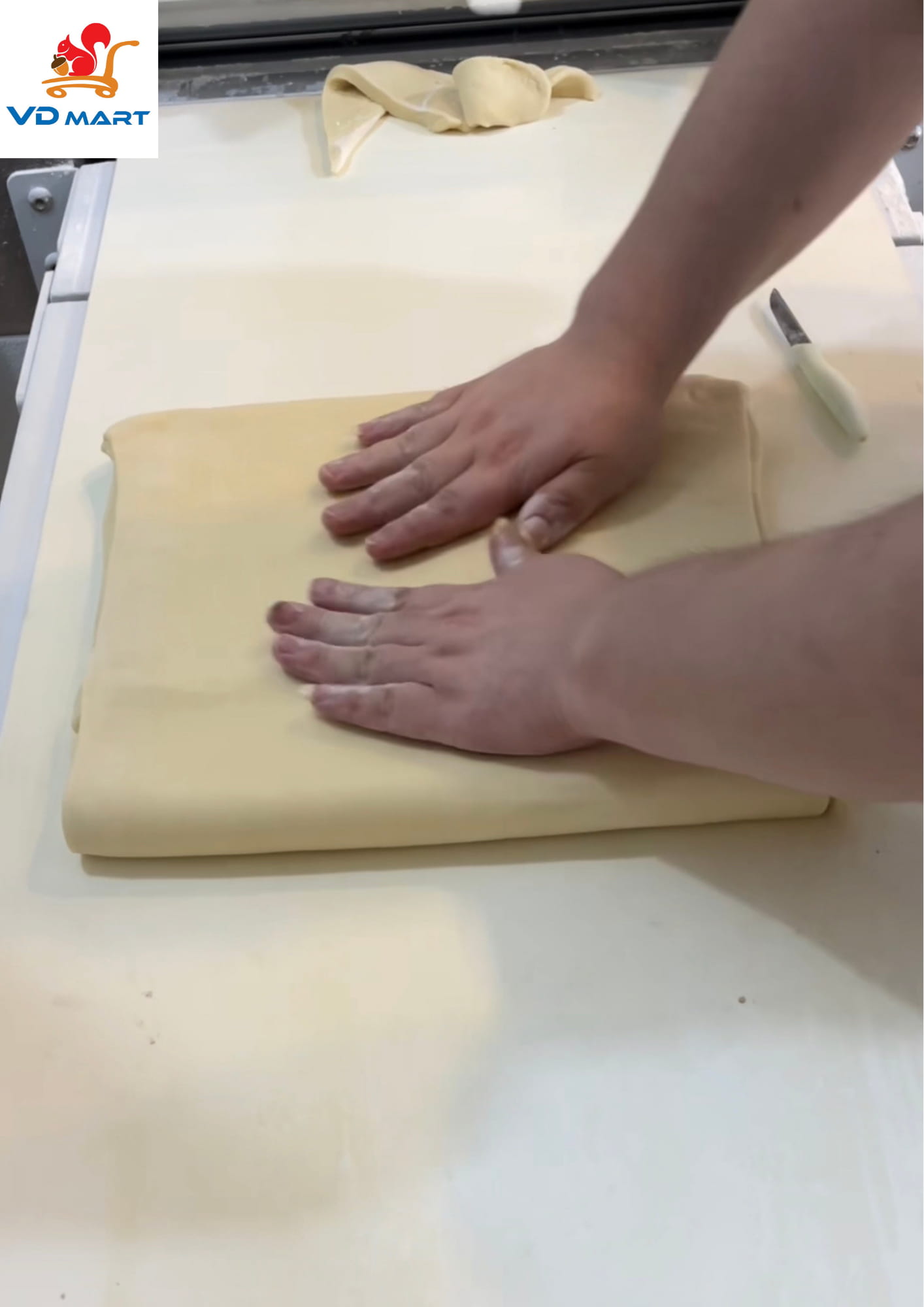 - Phần bột: Dàn mỏng thành hình chữ nhật có kíc thước 37x 72cm. Đặt miếng bơ đã cán mỏng trước đó vào chinhe giữa miếng bột.Gấp 2 đầu 2 bên lên phía trên miếng bơ.