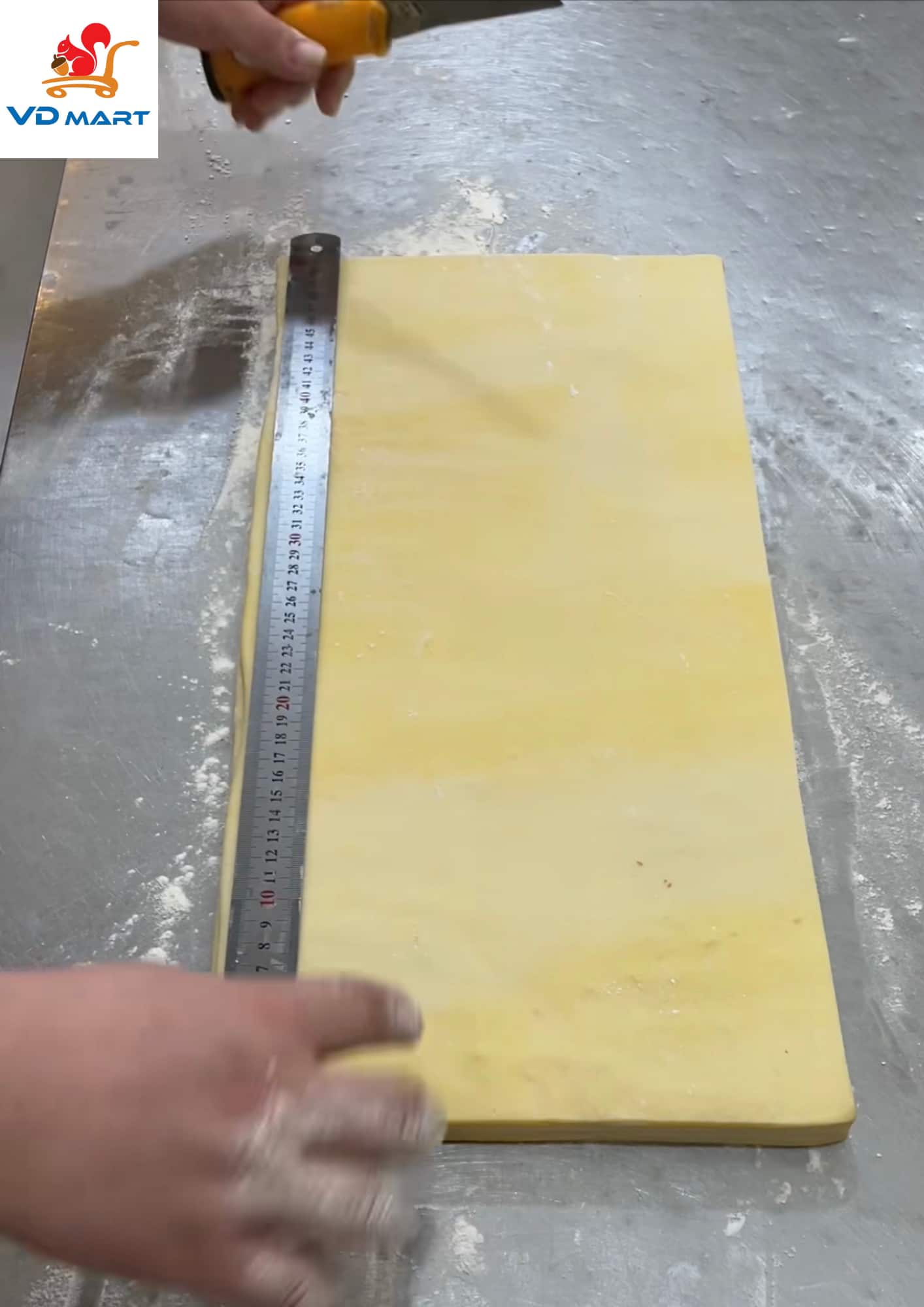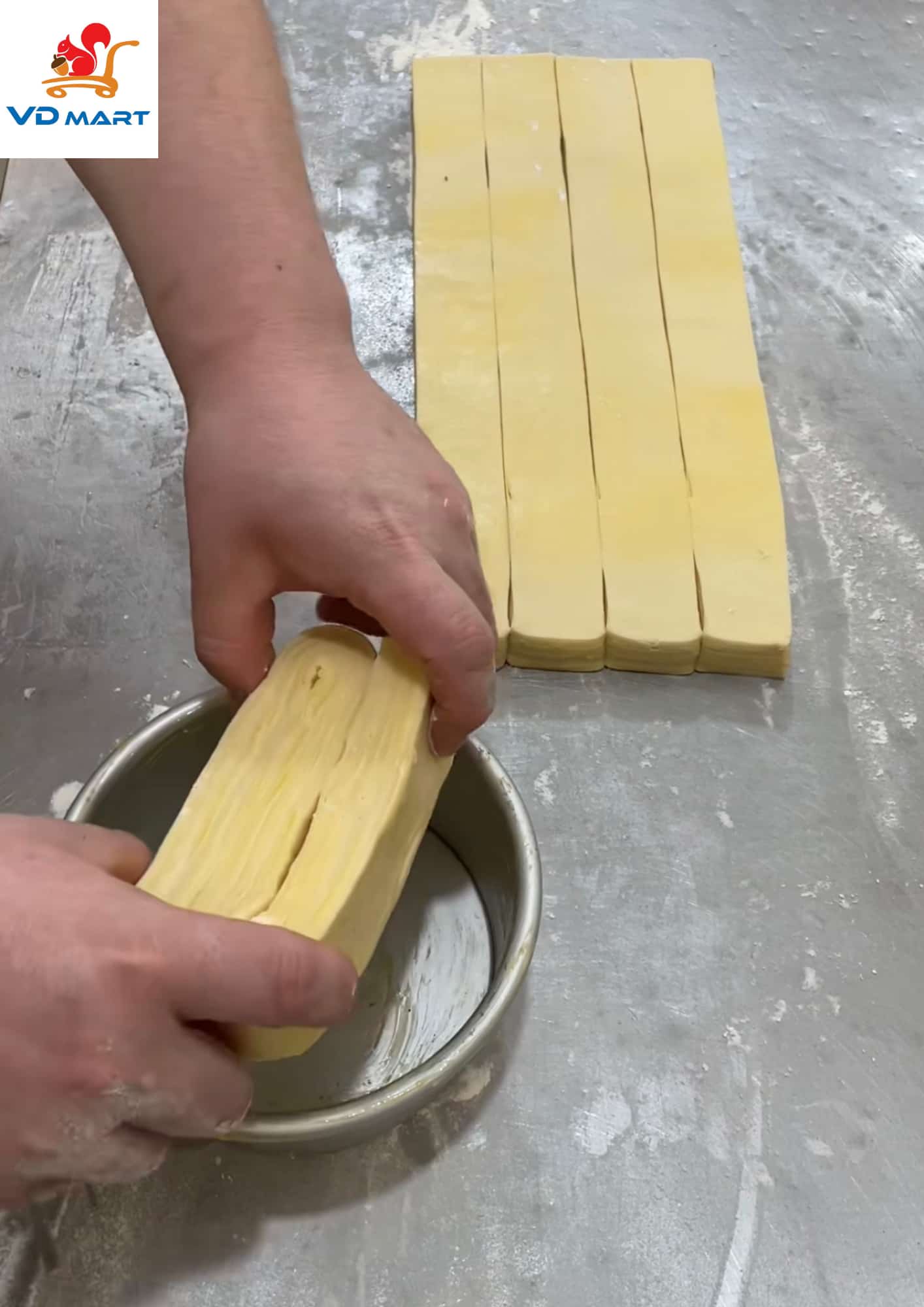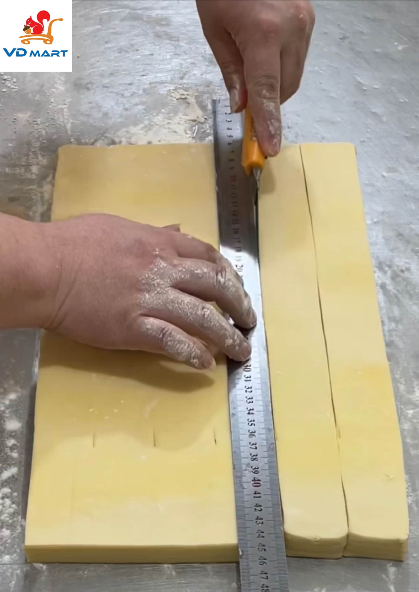 - Cắt bột theo chiều dọc, chia thành 6 phần bằng nhau (bề rộng 5cm). Chú ý đường cắt dứt khoát, sắc nét