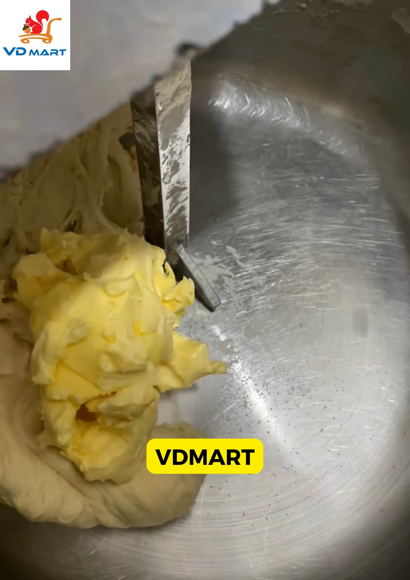 - Sau đó cho bơ (phần 210g) vào và nhồi tiếp đến khi bột kéo màng mỏng, k dính tay là đạt. (Tổng thời gian nhồi chừng 20 phút)