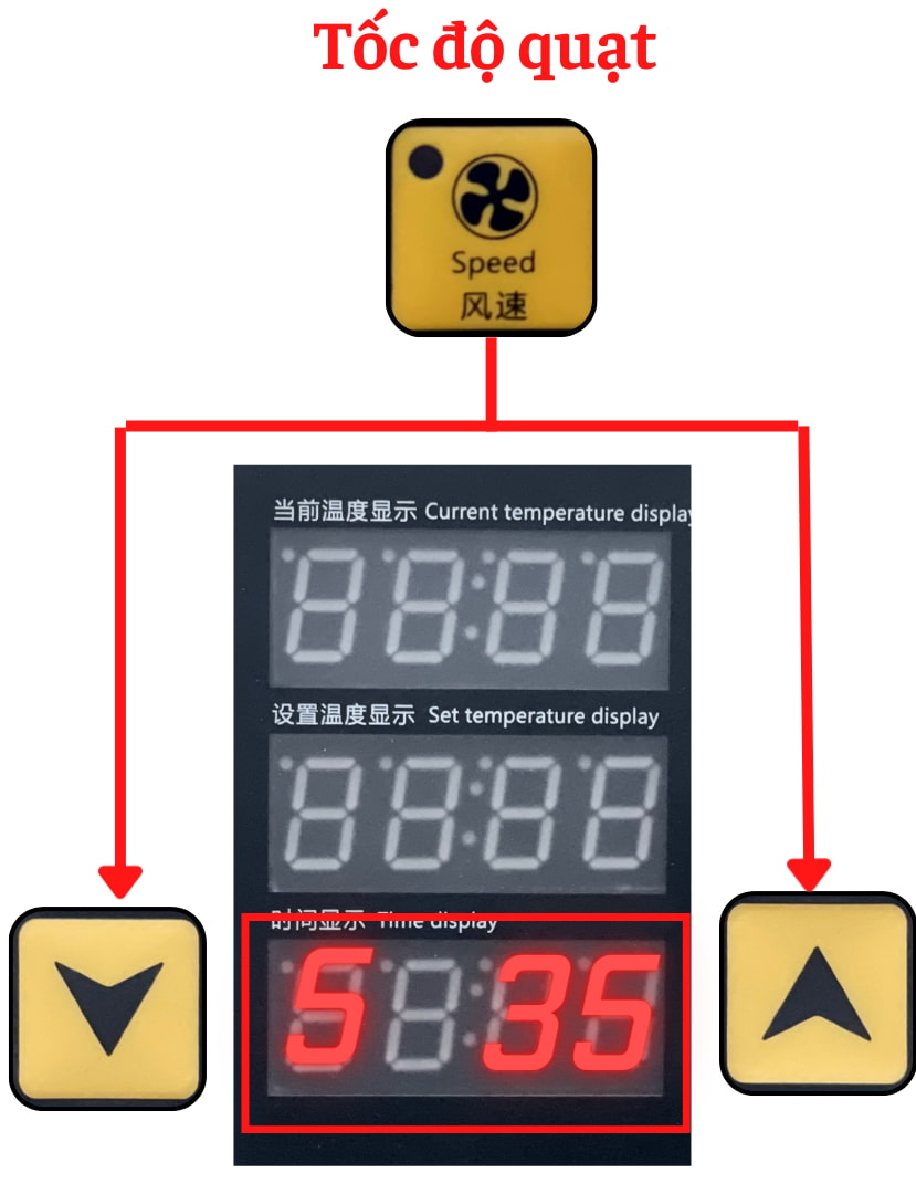 - Trong lúc cài đặt nhiệt độ hoặc trong quá trình nướng, chúng ta có thể điều chỉnh tốc độ quạt gió từ 5 - 35 để phù hợp với từng loại bánh và phù hợp với số lượng nướng bánh