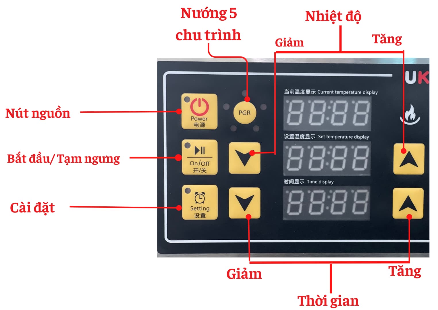 B9: Nhấn nút PGR lần 5 để chọn Nhiệt độ, Thời gian nướng cho chu trình biểu đồ nhiệt thứ 5. Chọn tương tự B6