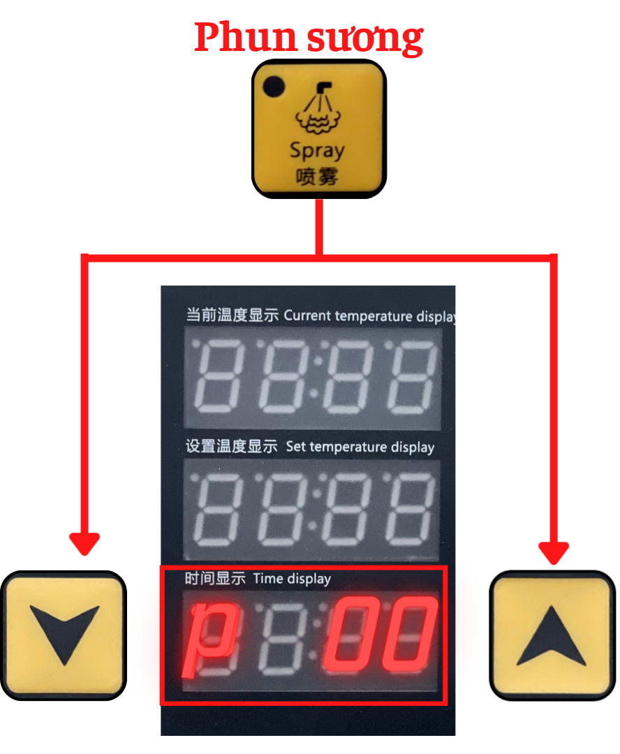 Nhấn nút PHUN SƯƠNG: lúc này ở màn hình hiển thị bên dưới cùng hiển thị chữ P 00 => Chúng ta nhấn nút TĂNG hoặc GIẢM bên cạnh màn hình hiển thị thứ 3 dưới dùng để điều chỉnh thời gian phun sương (đơn vị: giây)