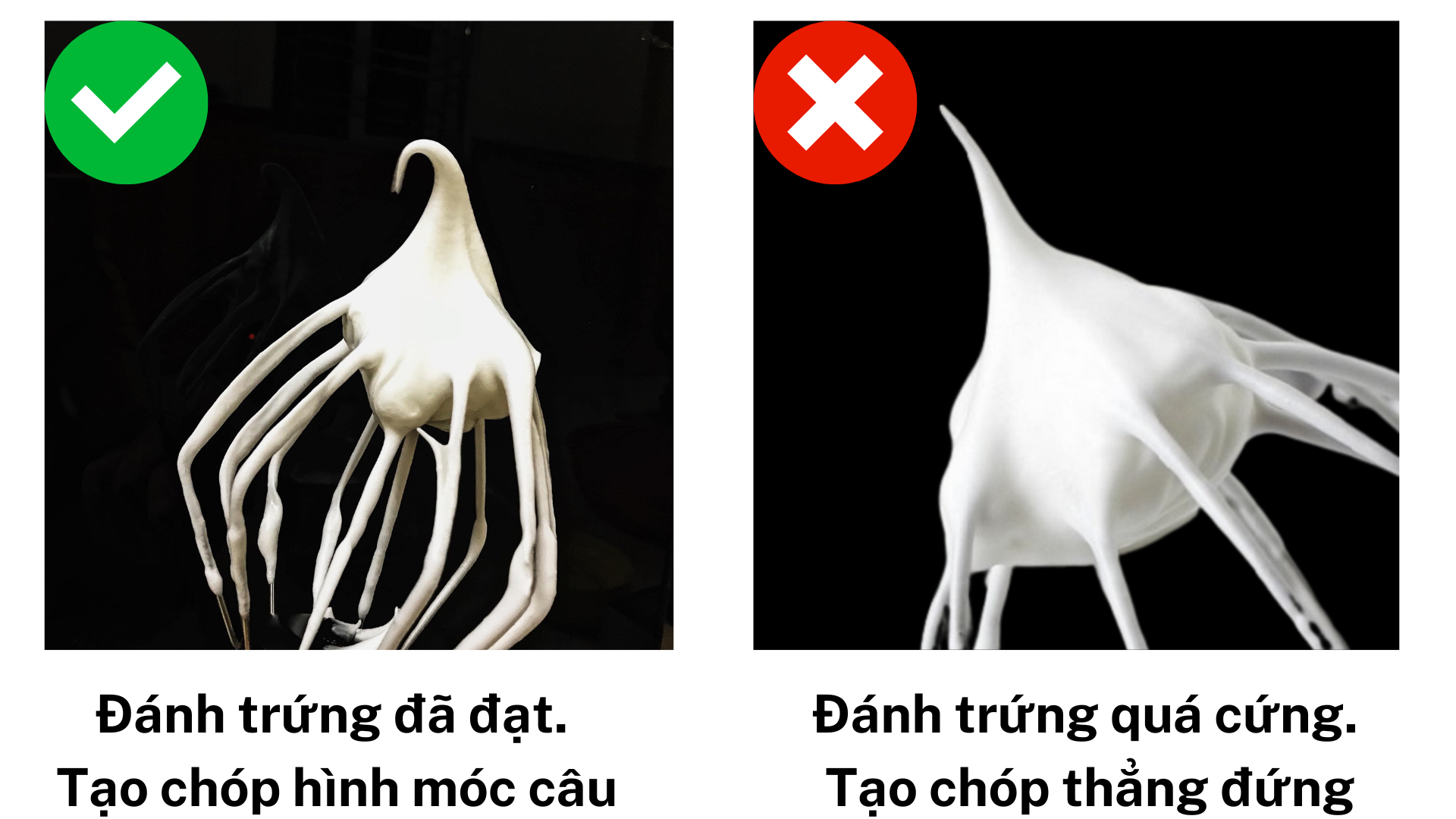 Nếu đánh trứng quá bông, tạp chóp thẳng đứng là đã đánh quá. Đây chính là một trong các lý do có thể dẫn đến bánh bị xẹp. và nứt mặt bánh