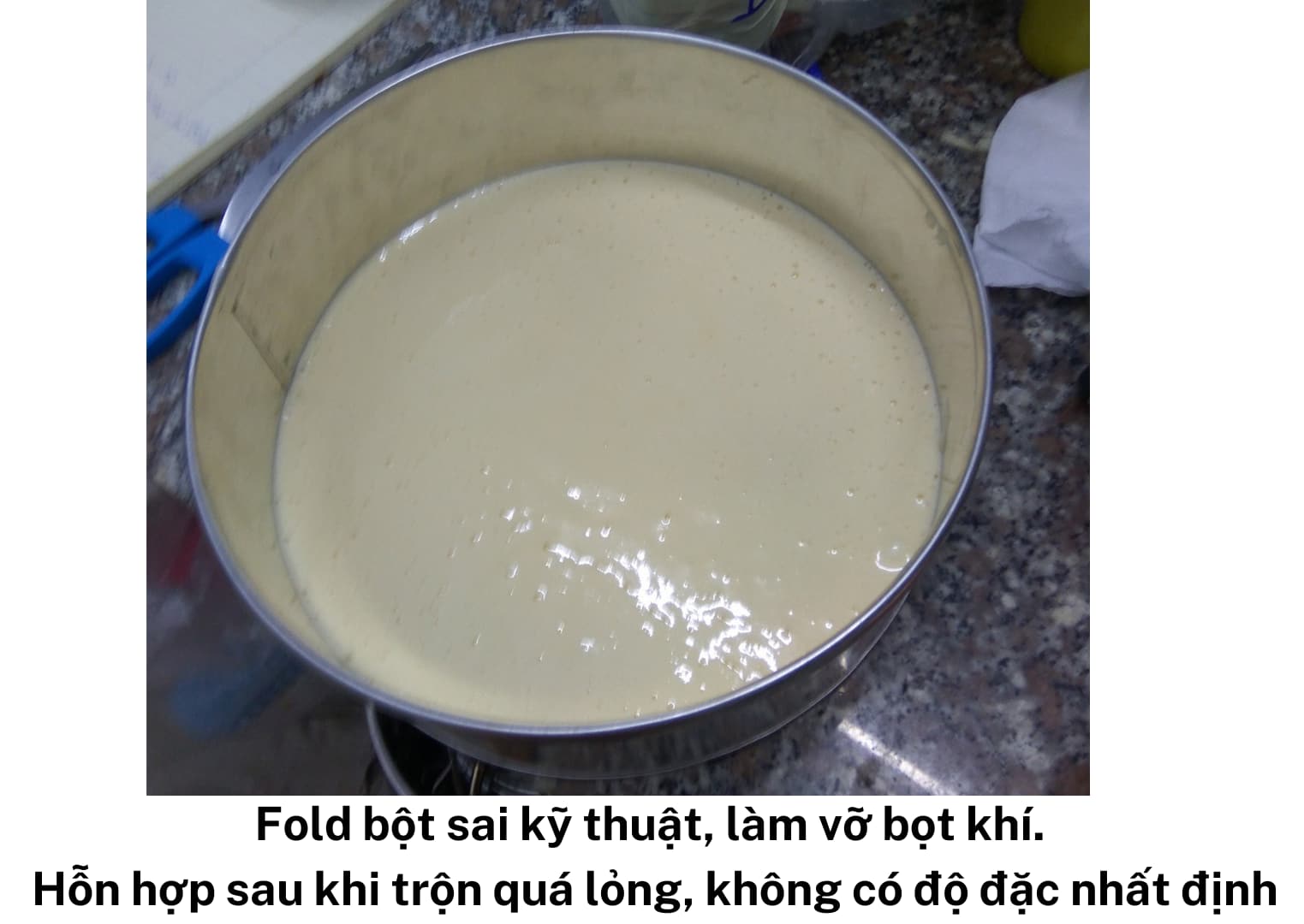 Khâu trộn hỗn hợp lòng trắng và lòng đỏ cũng cực kì quan trọng. Nếu trộn sai kỹ thuật, rất dễ khiến cho các bọt khí trong lòng trắng trứng bị vỡ dẫn đến bánh khi nướng nở không tốt hoặc không nở luôn. Bánh nướng xong sẽ bị đặc một khối, không có độ bông xốp.