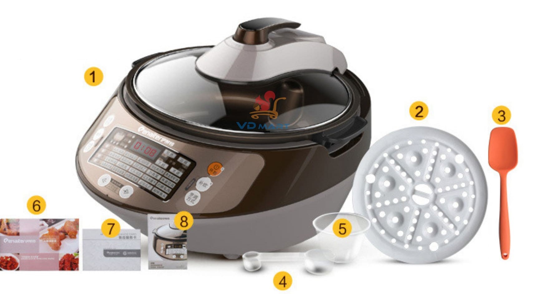 - Phụ kiện đi kèm: 1 nối chống dính, 1 phới silicon, 1 muỗng đong,1 cốc đong, 1 vỉ hấp, 1 dao quay